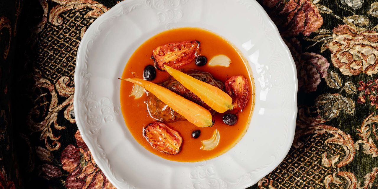 - Daube (томлёная говяжья щека, апельсиновый соус, маринованный виноград) — 1500 руб.