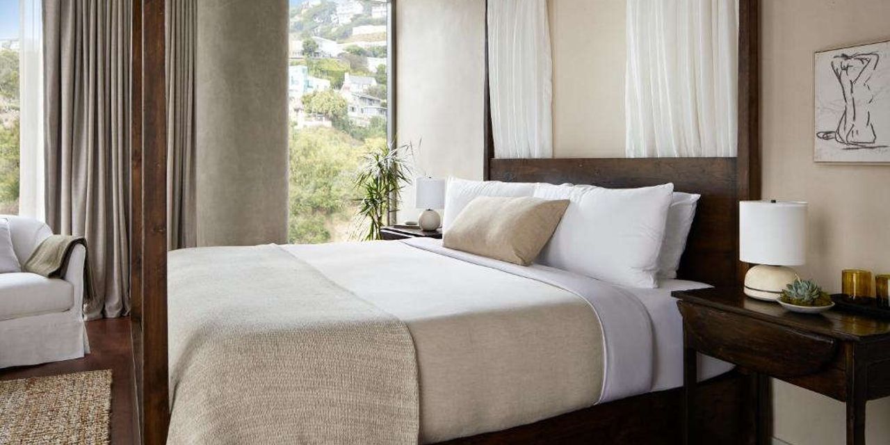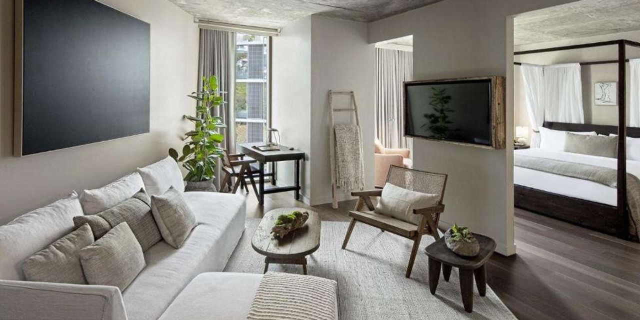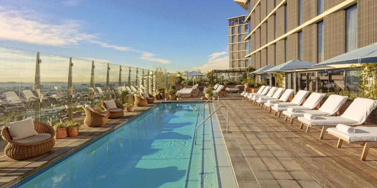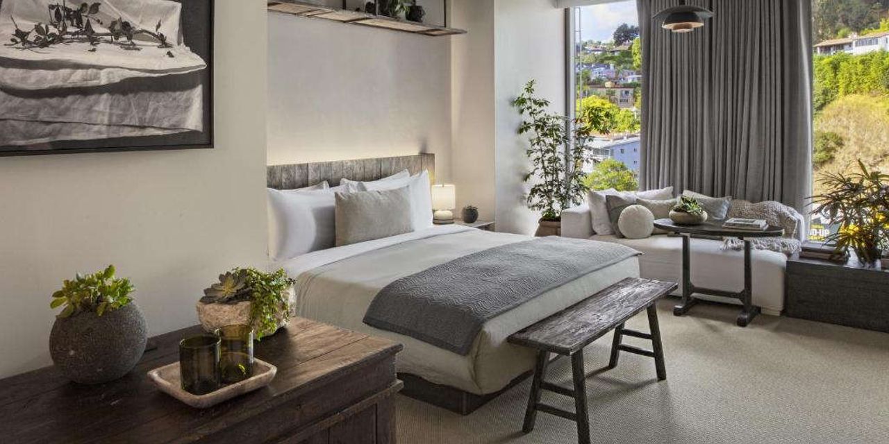 Бетонный фасад отеля, утопающий в пышной тропической зелени, свежо выделяется среди окружающих рекламных щитов. Войдя в вестибюль нижнего уровня – с открытыми деревянными балками на потолке, натуральными тканями природных тонов на диванах и массивной неполированной столешницей лобби-бара, чувствуешь себя так, словно оказался далеко от кипучего Лос-Анджелеса. Внутри растений ещё больше – есть коллекционные экземпляры, которым обеспечен идеальный уход.