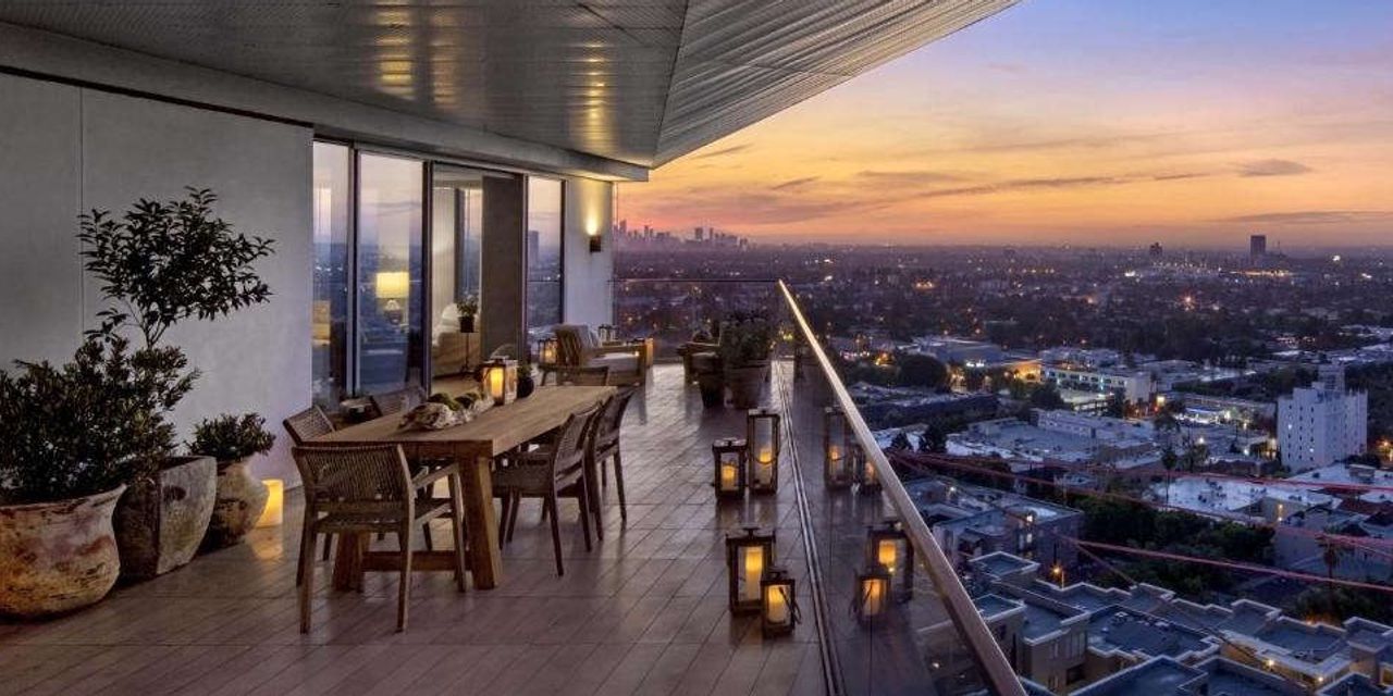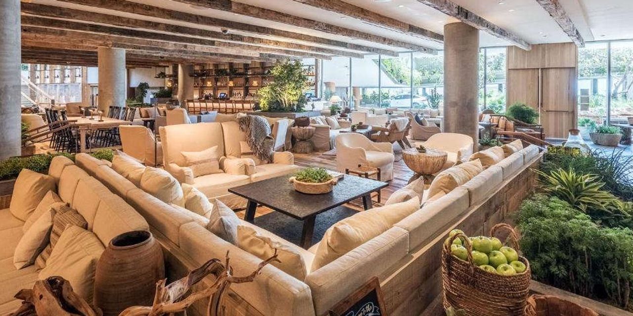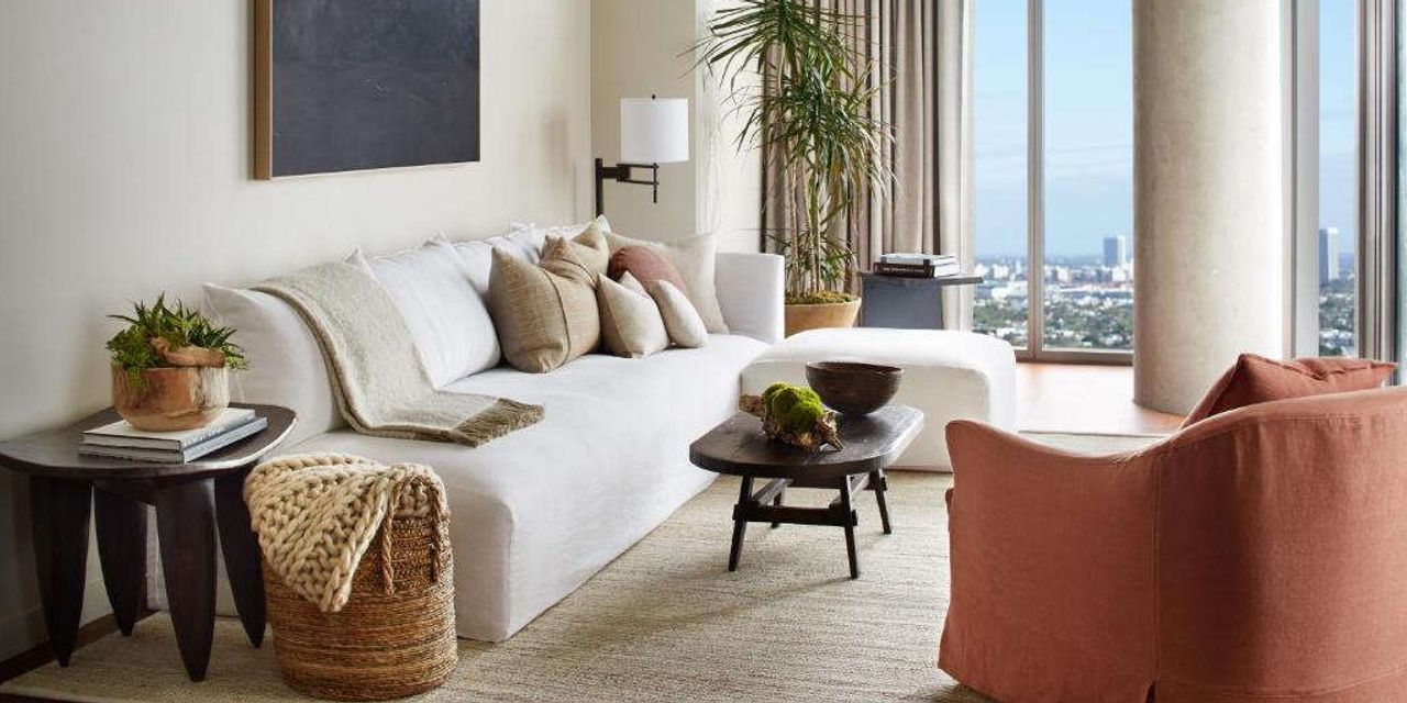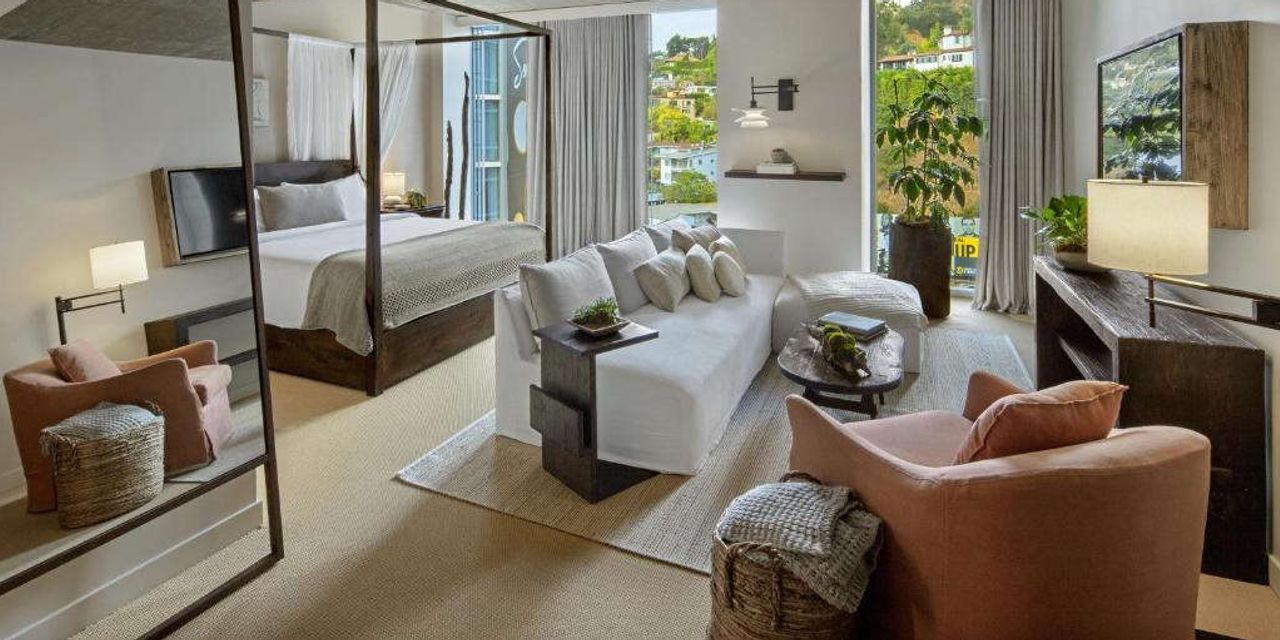 Бетонный фасад отеля, утопающий в пышной тропической зелени, свежо выделяется среди окружающих рекламных щитов. Войдя в вестибюль нижнего уровня – с открытыми деревянными балками на потолке, натуральными тканями природных тонов на диванах и массивной неполированной столешницей лобби-бара, чувствуешь себя так, словно оказался далеко от кипучего Лос-Анджелеса. Внутри растений ещё больше – есть коллекционные экземпляры, которым обеспечен идеальный уход.