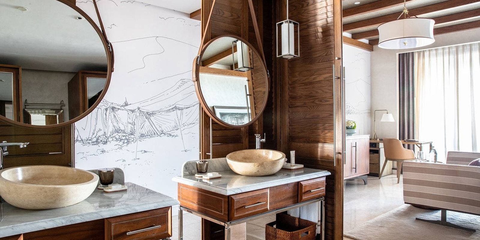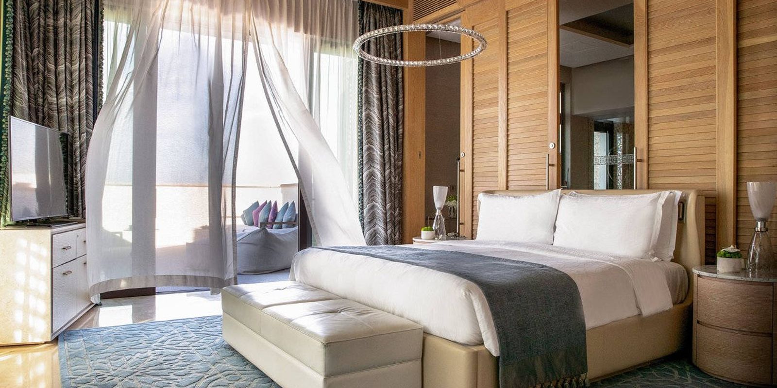 В отеле более 400 номеров разных категорий. В интерьерах — нейтральная цветовая палитра, светлые натуральные материалы и арабские дизайнерские акценты. Балконы выходят на море, сады и водоёмы. Есть номера с видом на башню Бурдж-аль-Араб или с террасой, переходящей в приватный участок пляжа. Особое внимание уделено тактильности — от фактурных покрытий до приглушённого освещения и сквозного ветерка в лаунж-зонах.