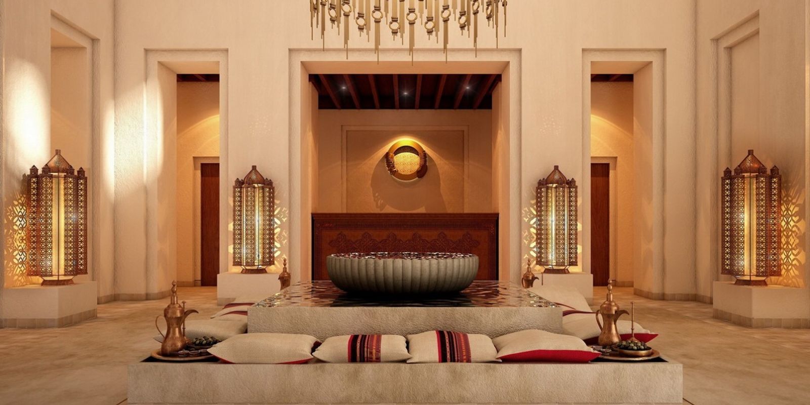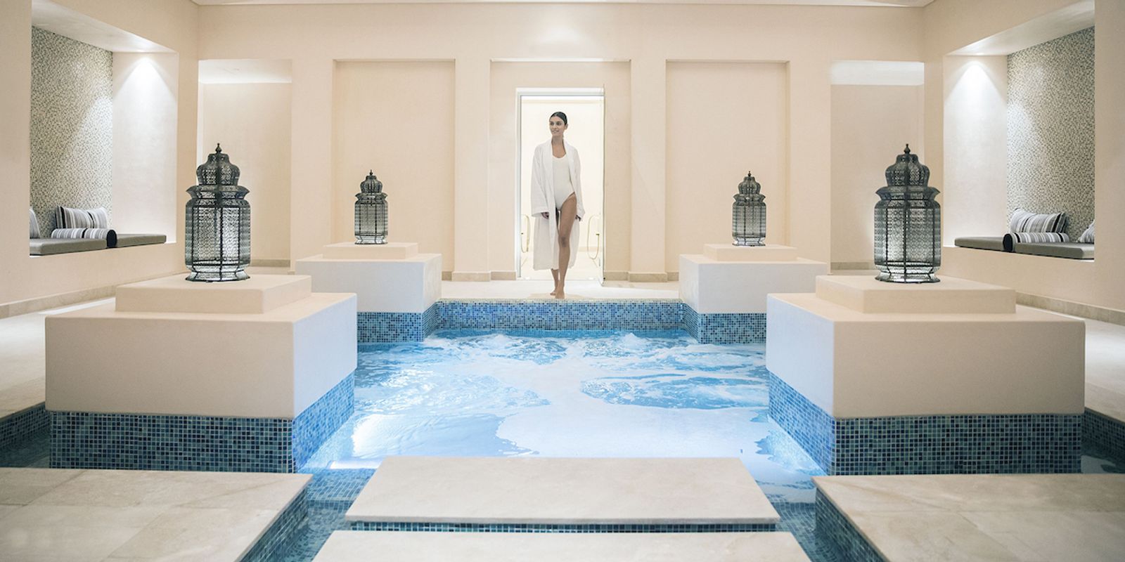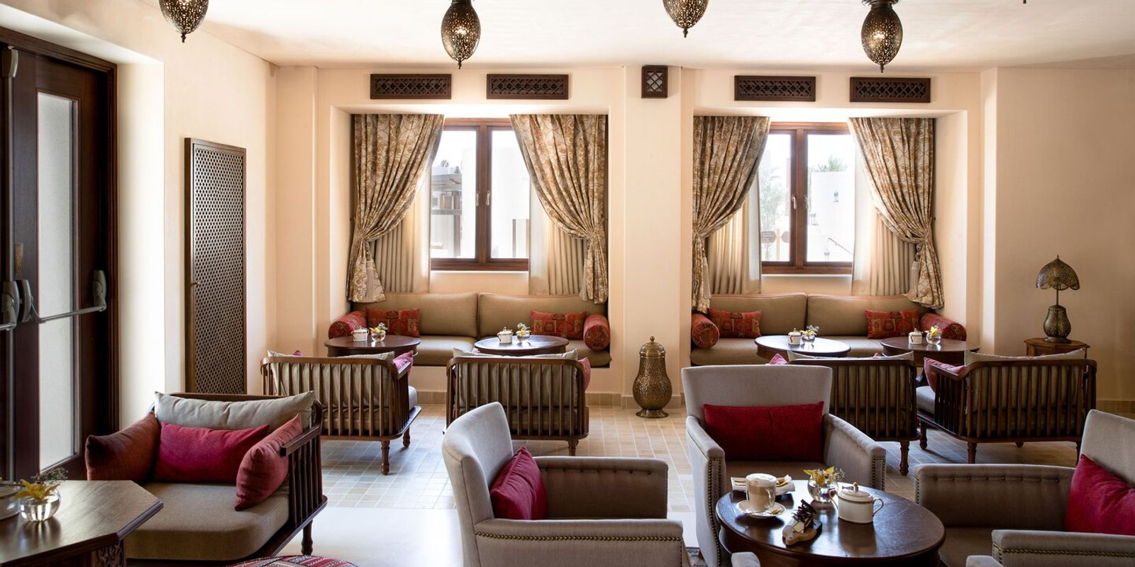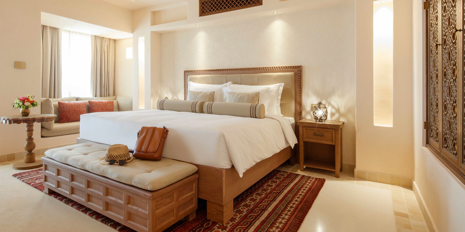К услугам гостей — 103 номера и виллы, декорированные в классическом арабском стиле и украшенные традиционными произведениями искусства, частные бассейны, фитнес-студия, спа-центр площадью 2200 кв. м, рестораны арабской и итальянской кухни.