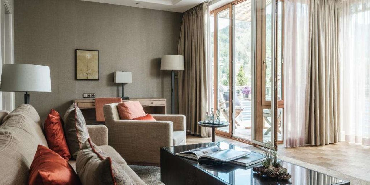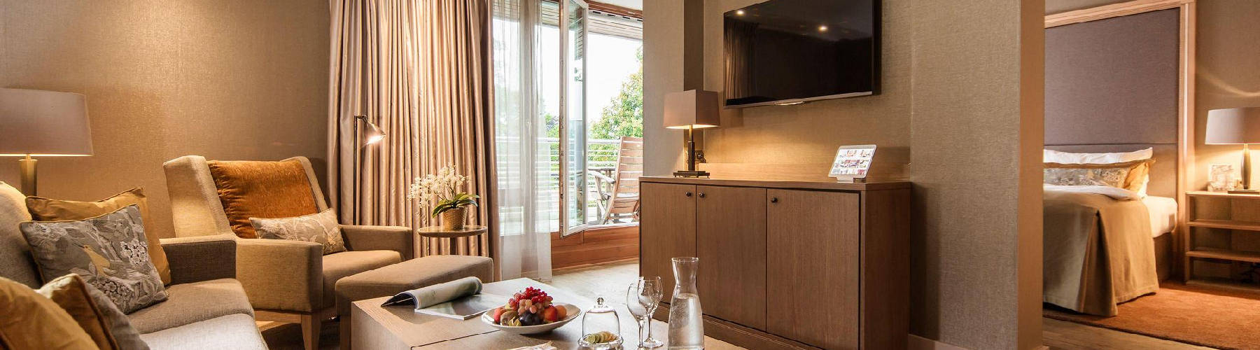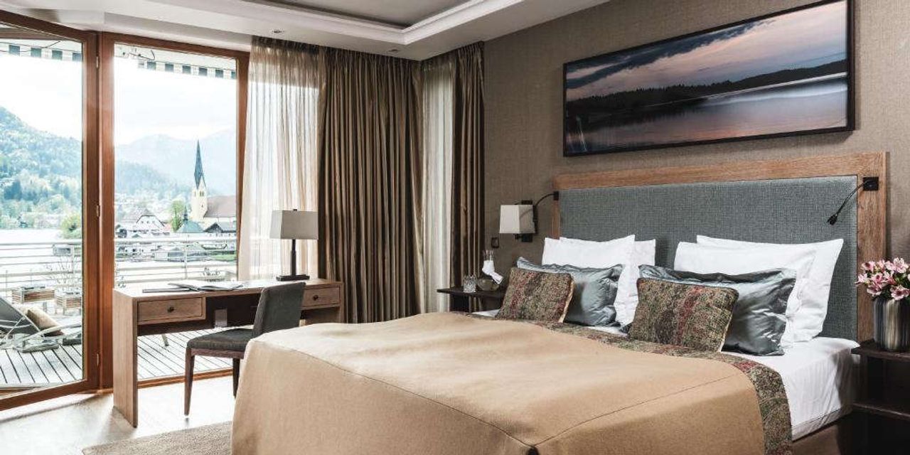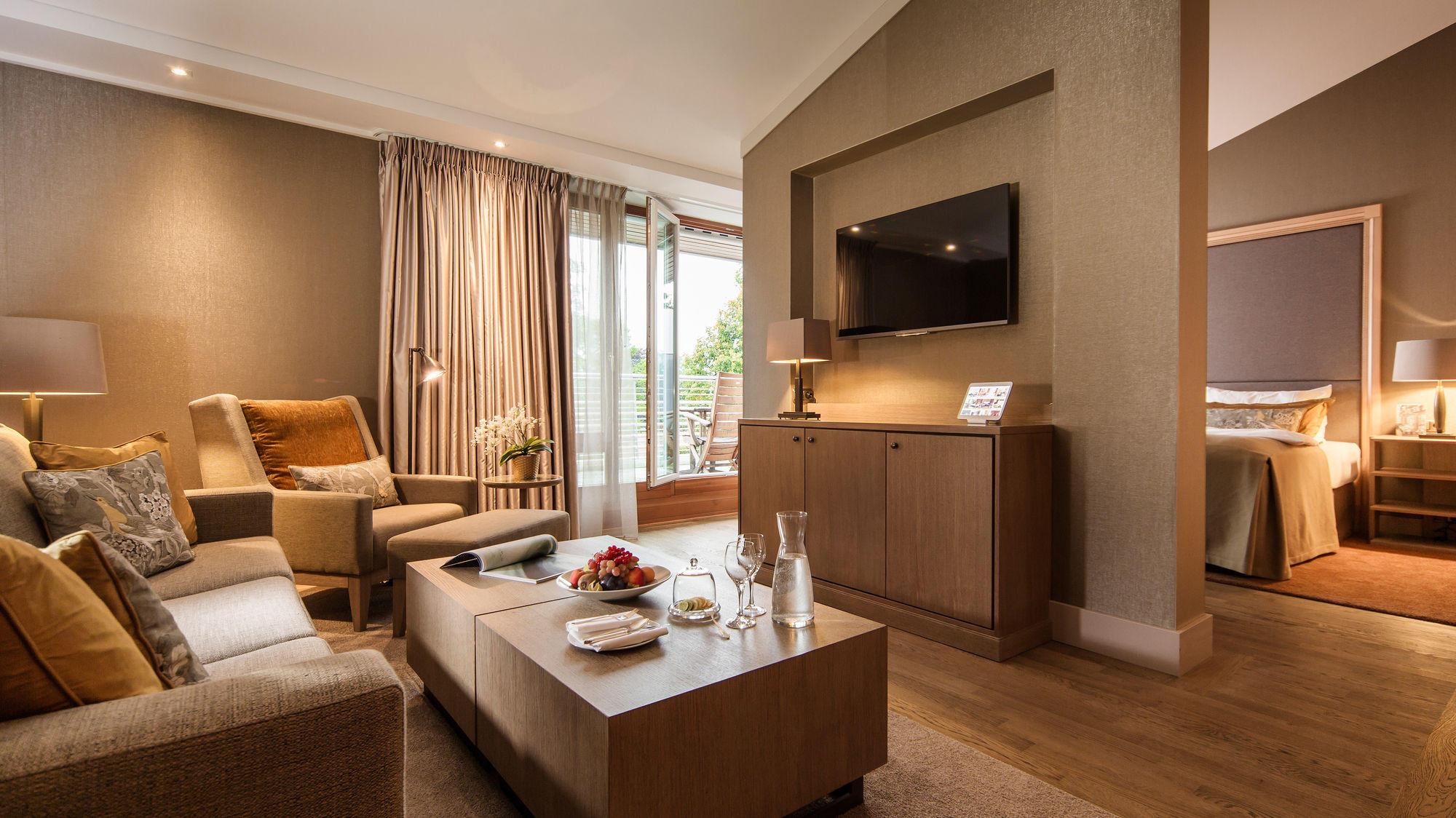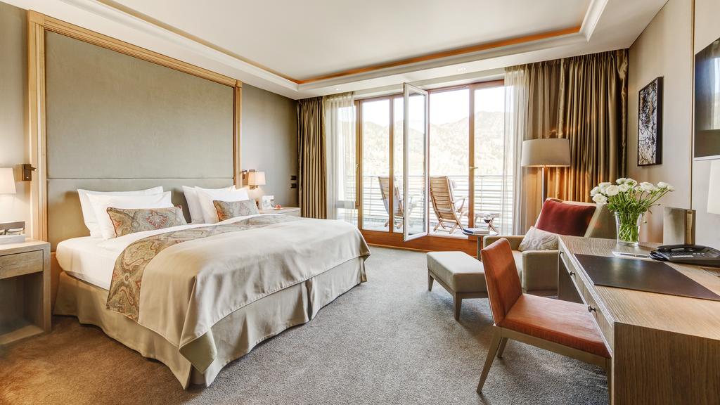 Номера и люксы обставлены в духе современной элегантной роскоши. В большинстве есть террасы и балконы с видом на озеро или горы.