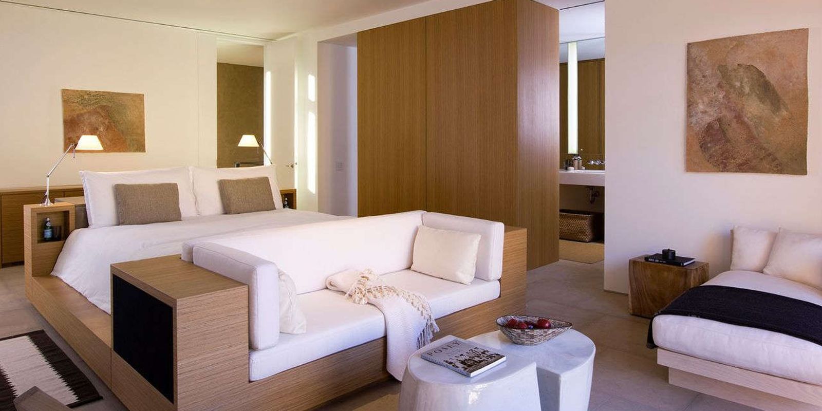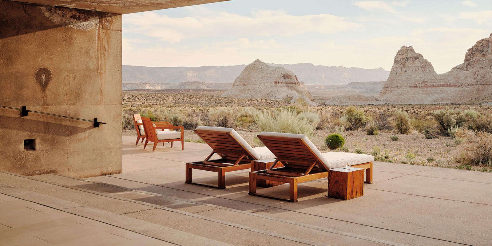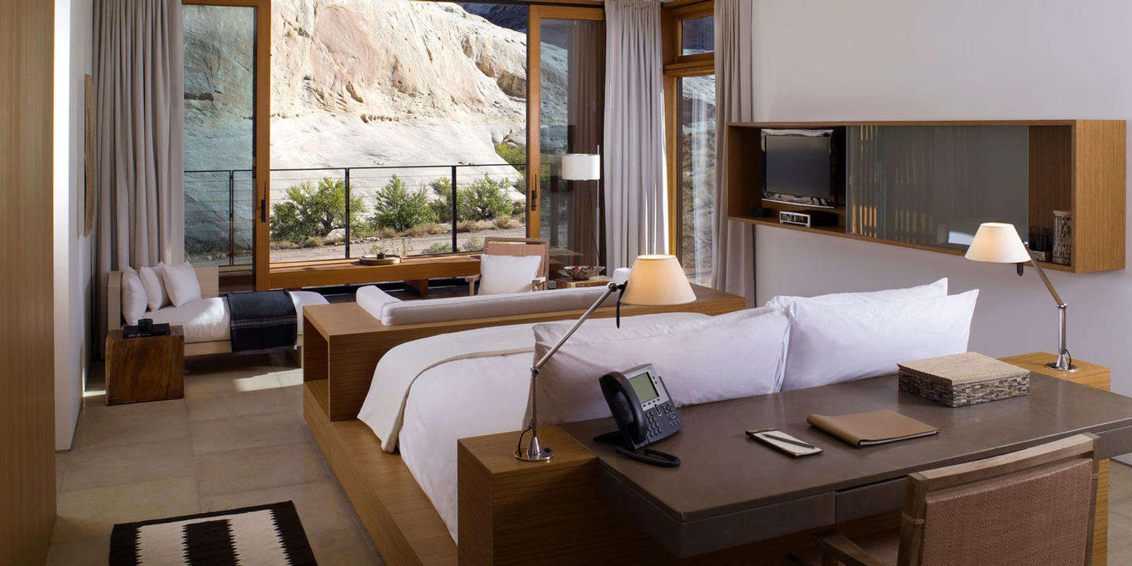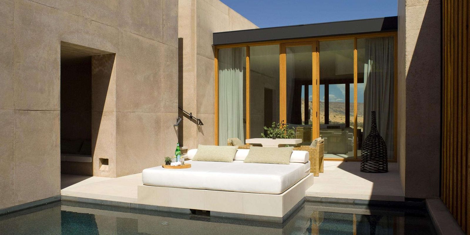 Проектом занимались калифорнийские архитекторы, выбравшие радикальный модернизм: лаконичные линии выстраиваются в строгие квадраты и прямоугольники, фасады из камня песочных оттенков напоминают о суровом нраве пустыни. Все 34 люкса декорированы в таком же медитативном духе аскезы: кожа, почерневшая сталь, обилие дерева, гладкий бетон, но главная роль и здесь отводится пейзажам.