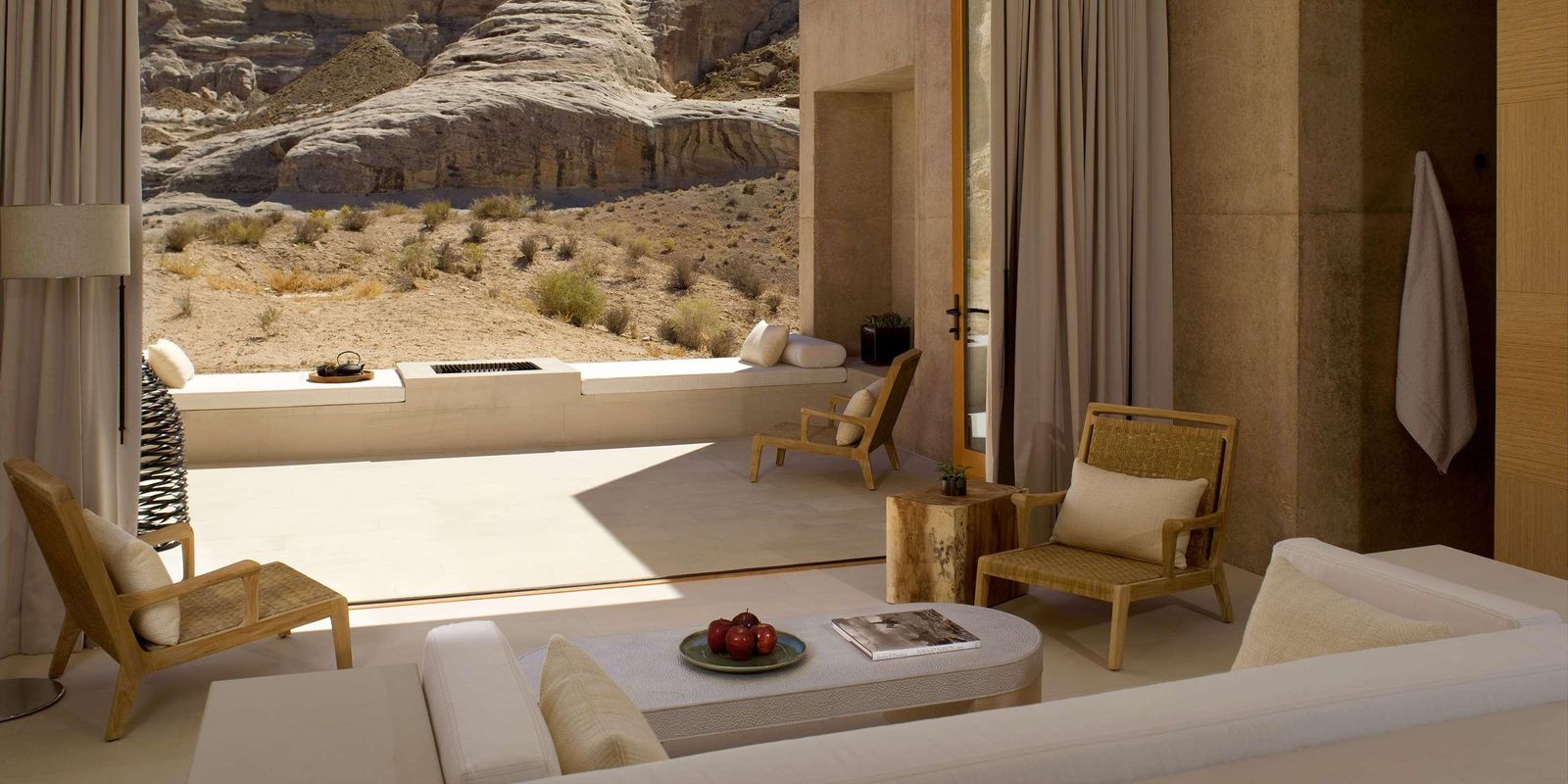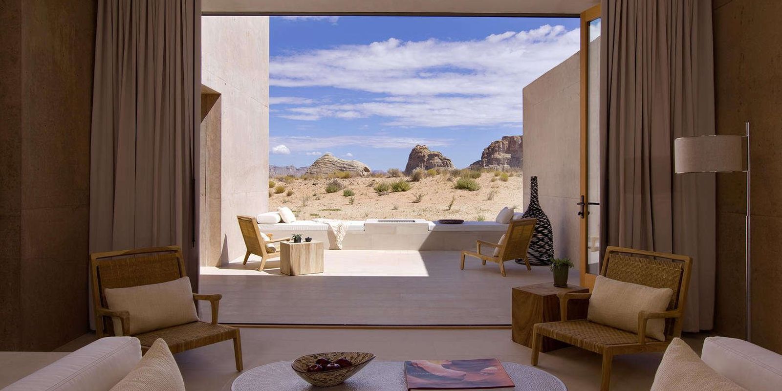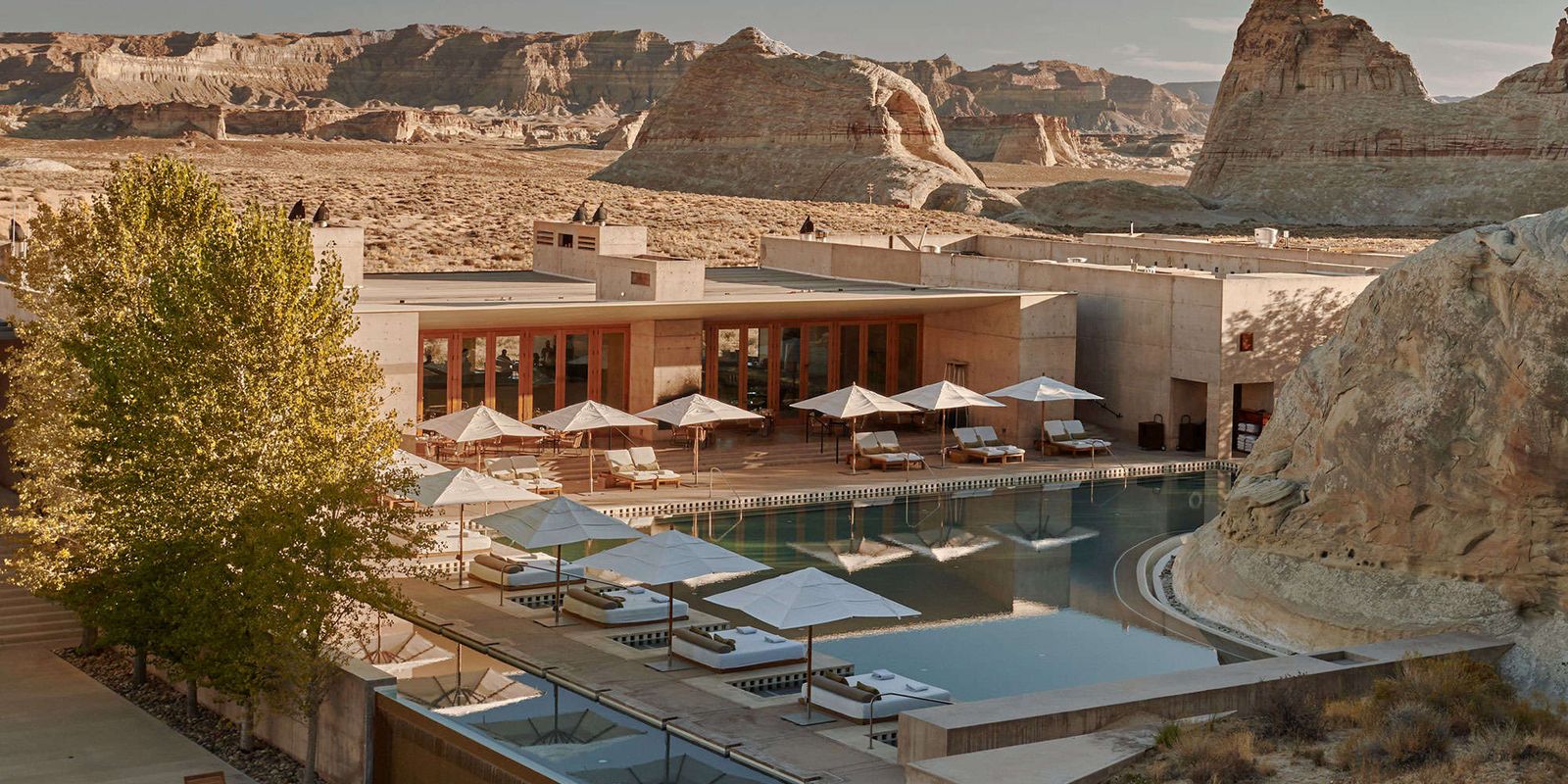 Архитектуру, дизайн и атмосферу отеля определила главная его «фишка» – в буквальном смысле неземной ландшафт из скал и песков. Расположившись посреди высокогорной пустыни, прямо внутри каньона Пойнт-Кэмпграунд, Amangiri практически сливается с гипнотическими пейзажами, полностью вовлекая в это единение своих постояльцев.