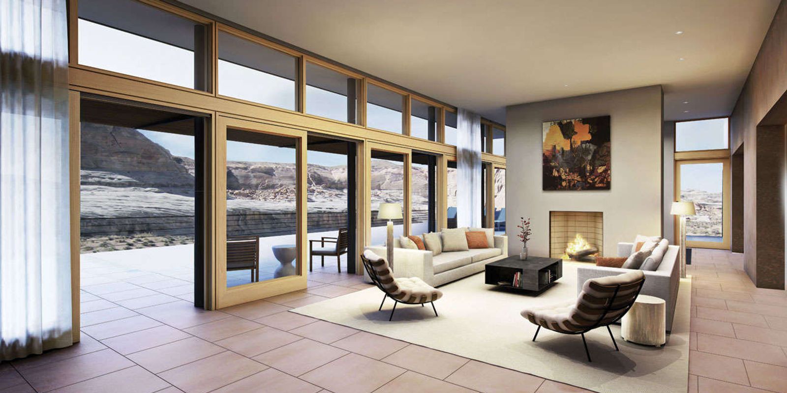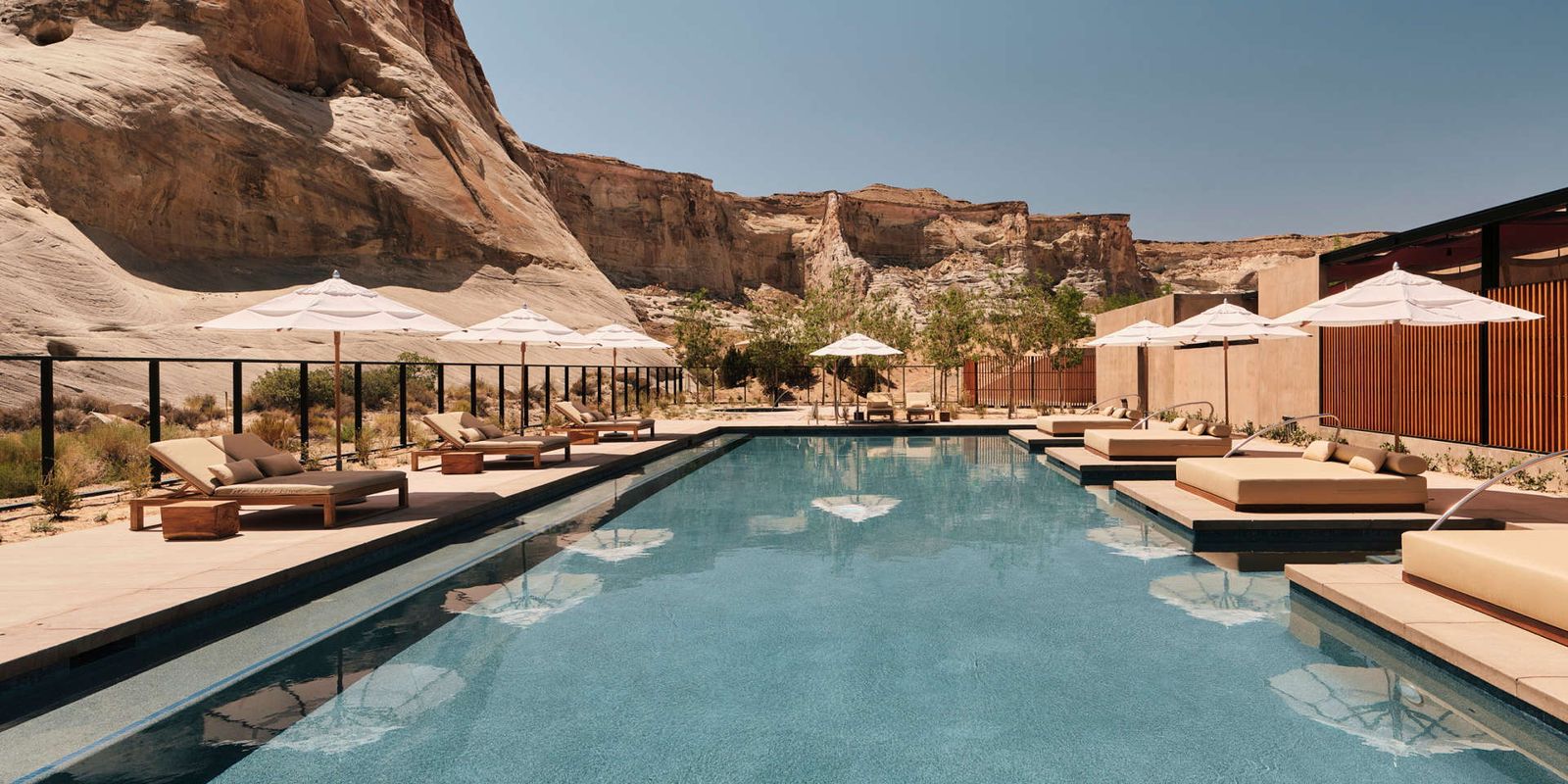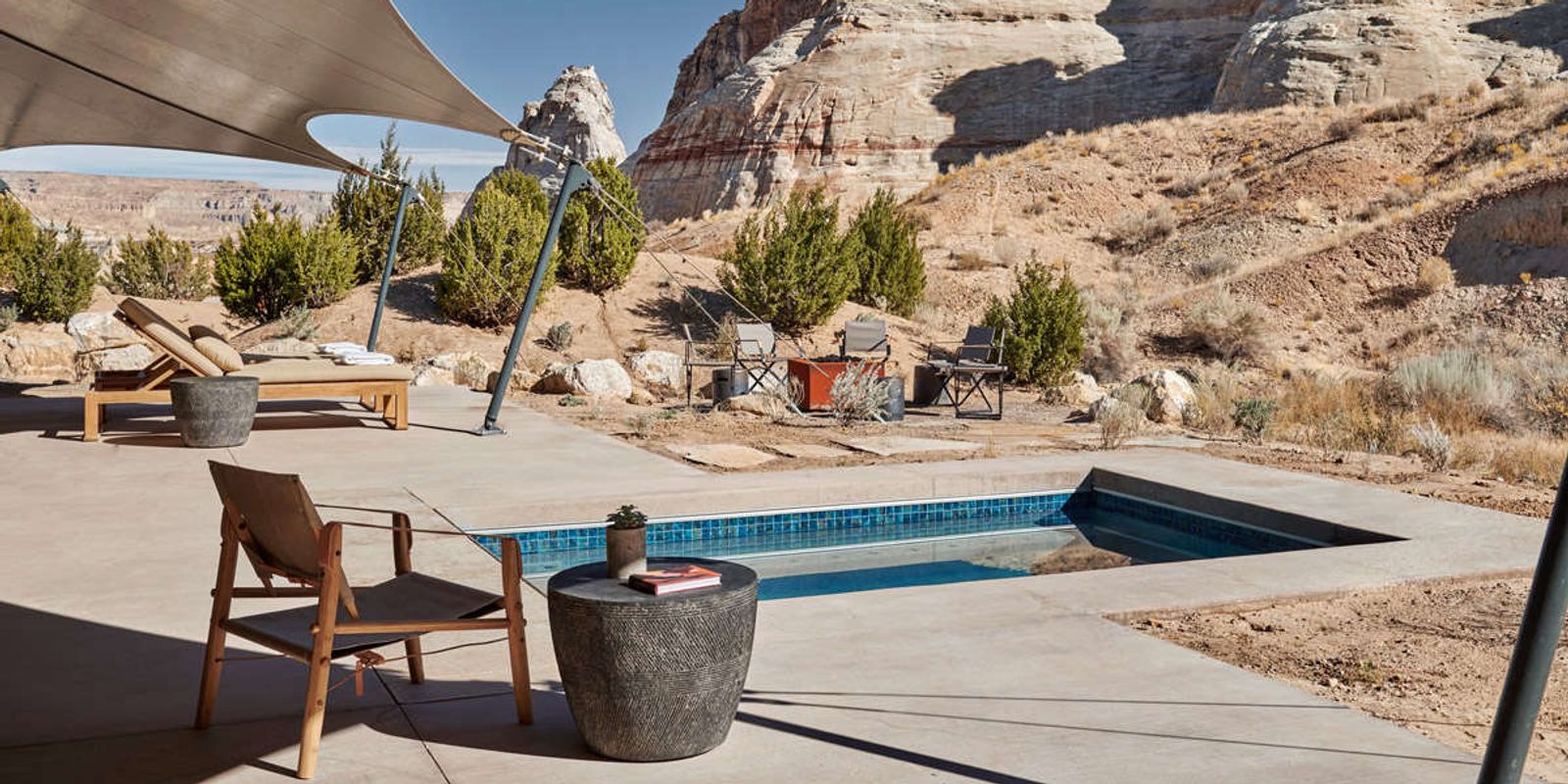 Архитектуру, дизайн и атмосферу отеля определила главная его «фишка» – в буквальном смысле неземной ландшафт из скал и песков. Расположившись посреди высокогорной пустыни, прямо внутри каньона Пойнт-Кэмпграунд, Amangiri практически сливается с гипнотическими пейзажами, полностью вовлекая в это единение своих постояльцев.