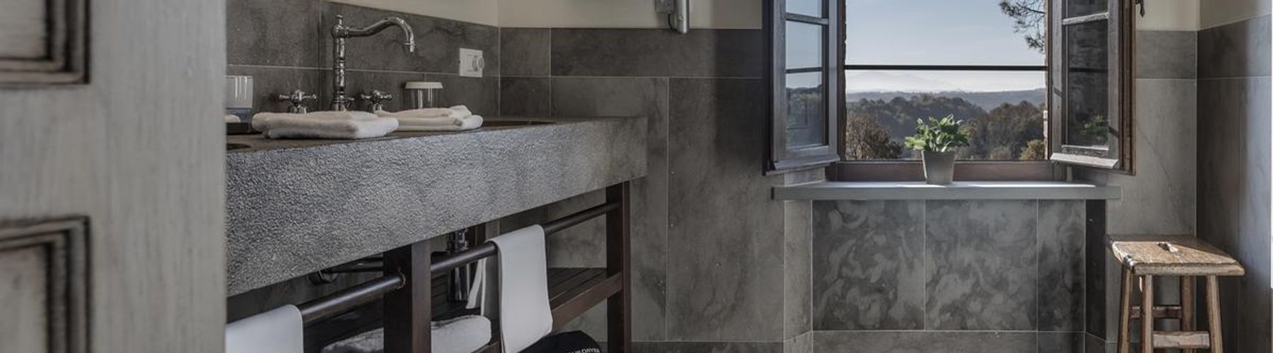 Номера оформлены в загородном стиле с использованием камня и дерева.