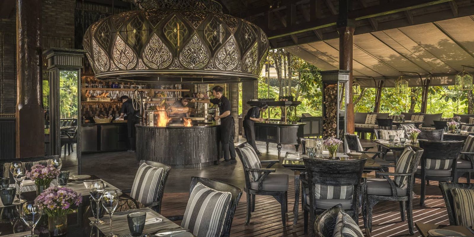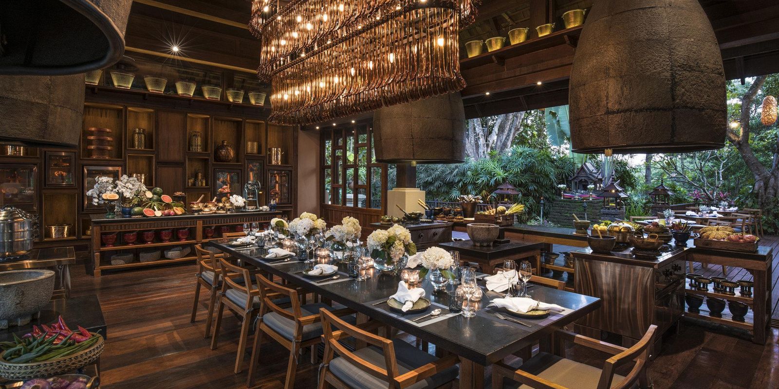 Гастрономическая карта объединяет тайские и европейские блюда; есть кулинарные мастер-классы. Кроме стандартного ресторана и бара, предлагается также романтическая опция для двоих — Rice Barn, навесная платформа для ужинов над озером.