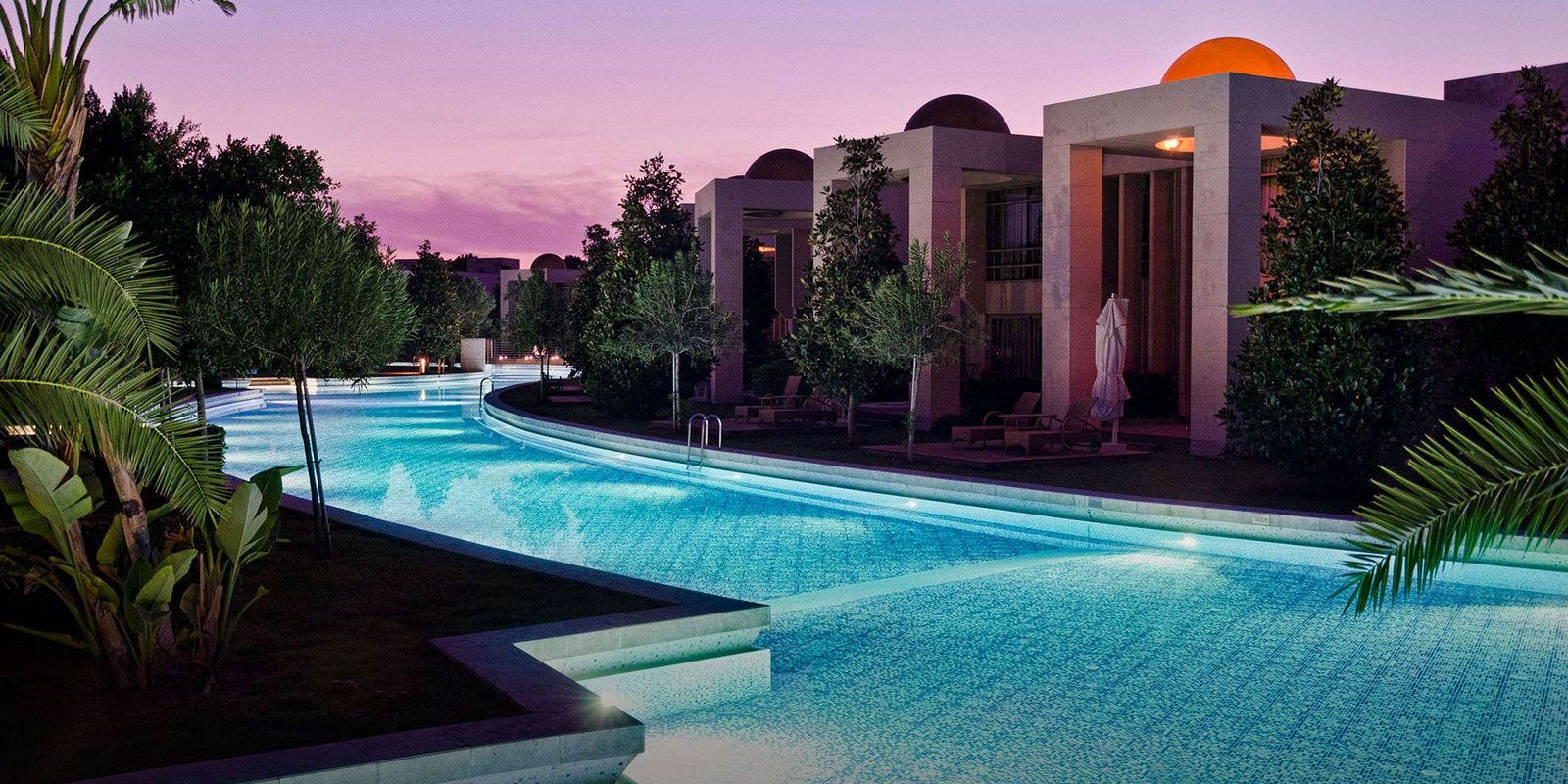 Три больших бассейна фантазийной формы соединяются живописными каналами в окружении изумрудных лужаек, кипарисов и цветущих магнолий. Полукилометровый пляж с плавучим островом из тёплого дерева великолепно оснащён: удобные шезлонги, эффектные зонтики из сухих пальмовых листьев и стилизованные под хижины палапы шатры у самой кромки воды.