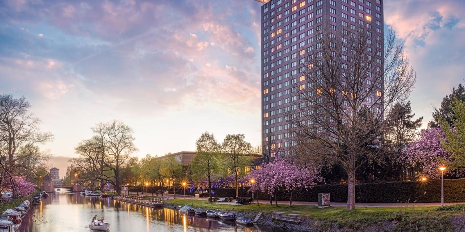 Современное многоэтажное здание отеля Okura Amsterdam эффектно контрастирует с ансамблем исторического центра города и сетью великолепных каналов.