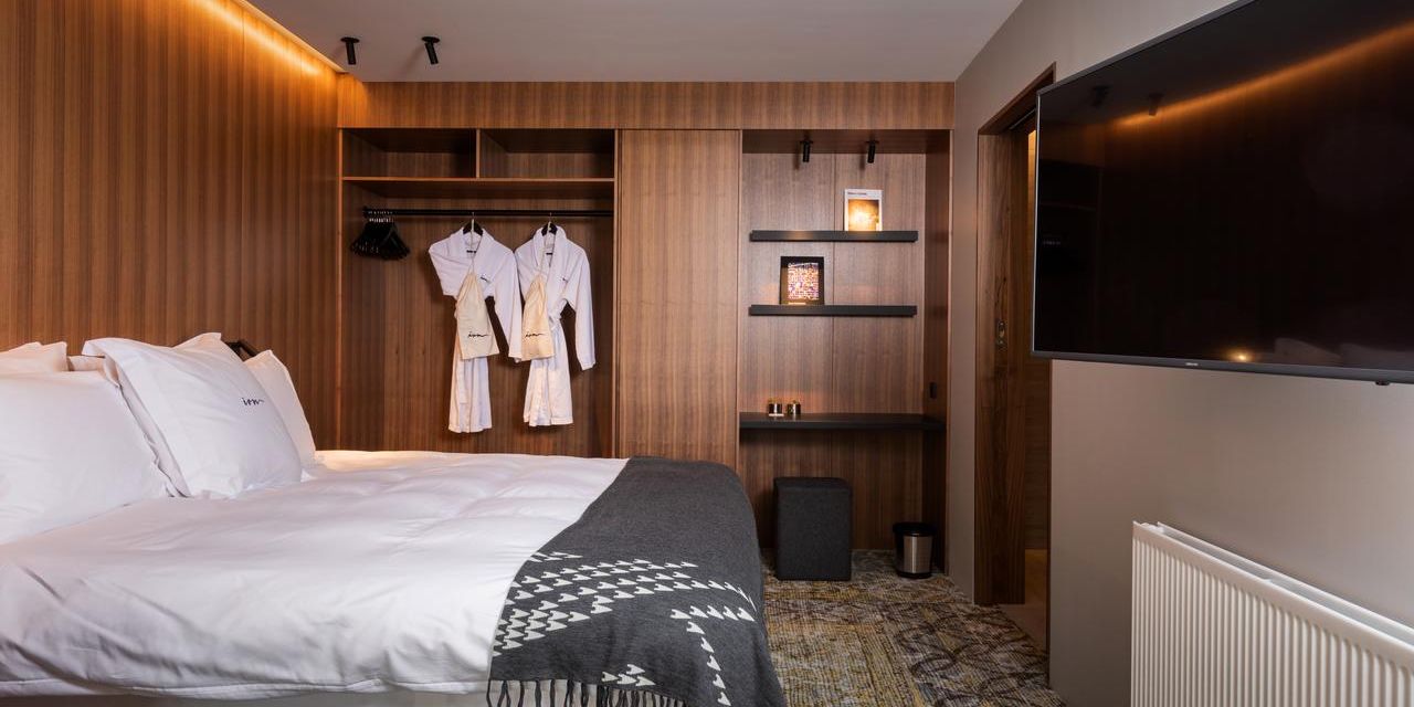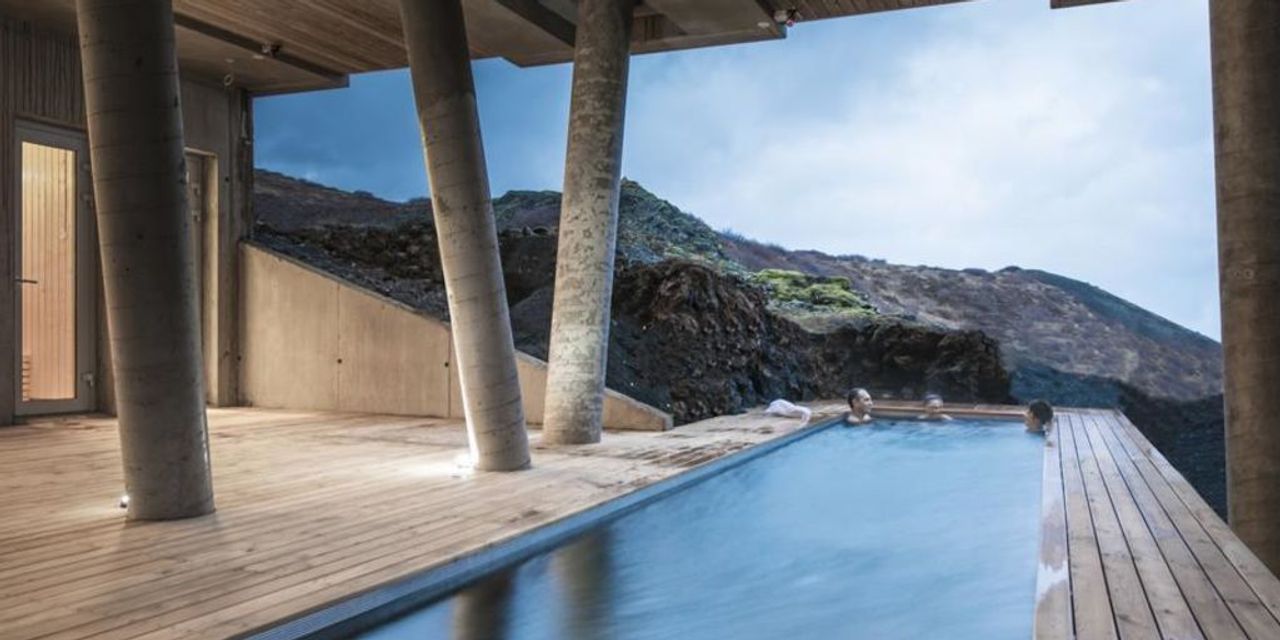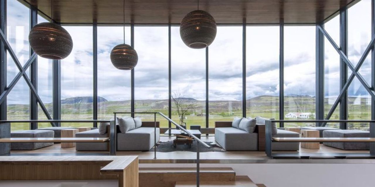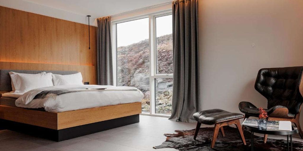 В 45 номерах и сьютах — теплые полы, гипоаллергенные постели, органическое постельное бельё и экологичные душевые системы. Во многих номерах — панорамные виды на лавовые поля или дымящиеся источники геотермальной станции.