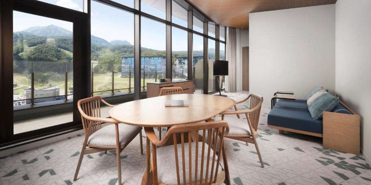 В интерьерах — технологичный японский минимализм: акцент на натуральные материалы и близость с природой, внимание к сезонности, отсутствие лишних деталей, большие панорамные окна с видом на долину и горы.