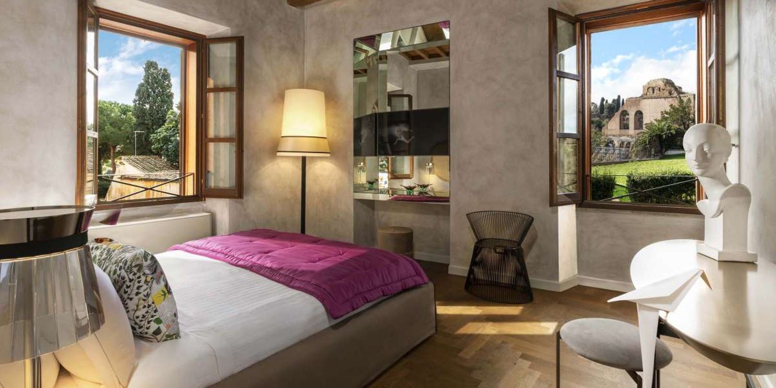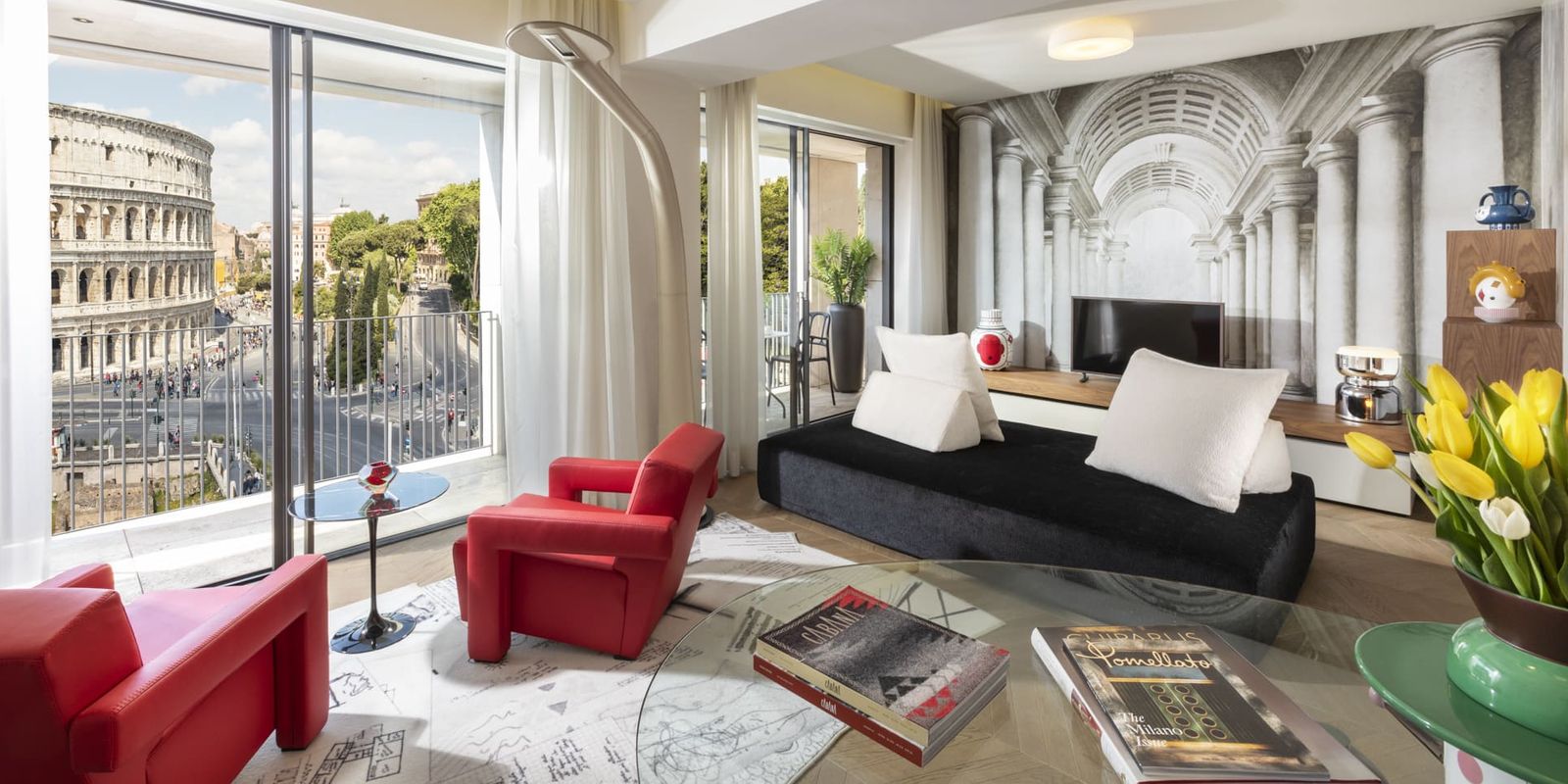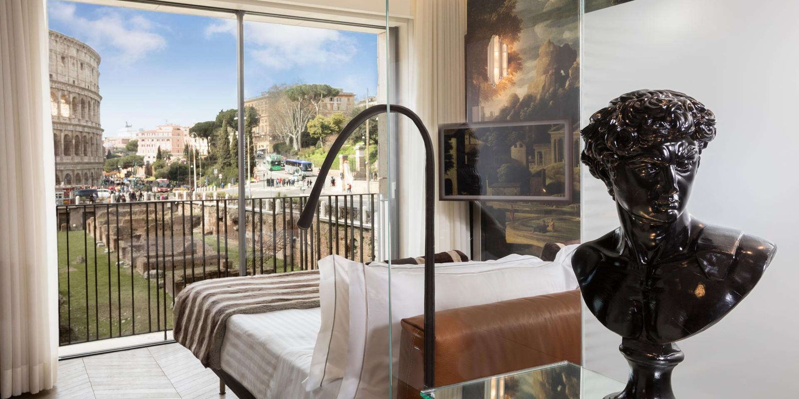 К услугам гостей — номера, люксы и дизайнерские апартаменты. Из некоторых открывается прямой вид на Колизей, так что гости могут любоваться его древней красотой, потягивая утренний чай в постели. Интерьеры оформлены в современном стиле с использованием дорогого мрамора и бархата. Ванные комнаты оснащены косметикой Bulgari, а в номерах установлены аудиосистемы Bang & Olufsen.