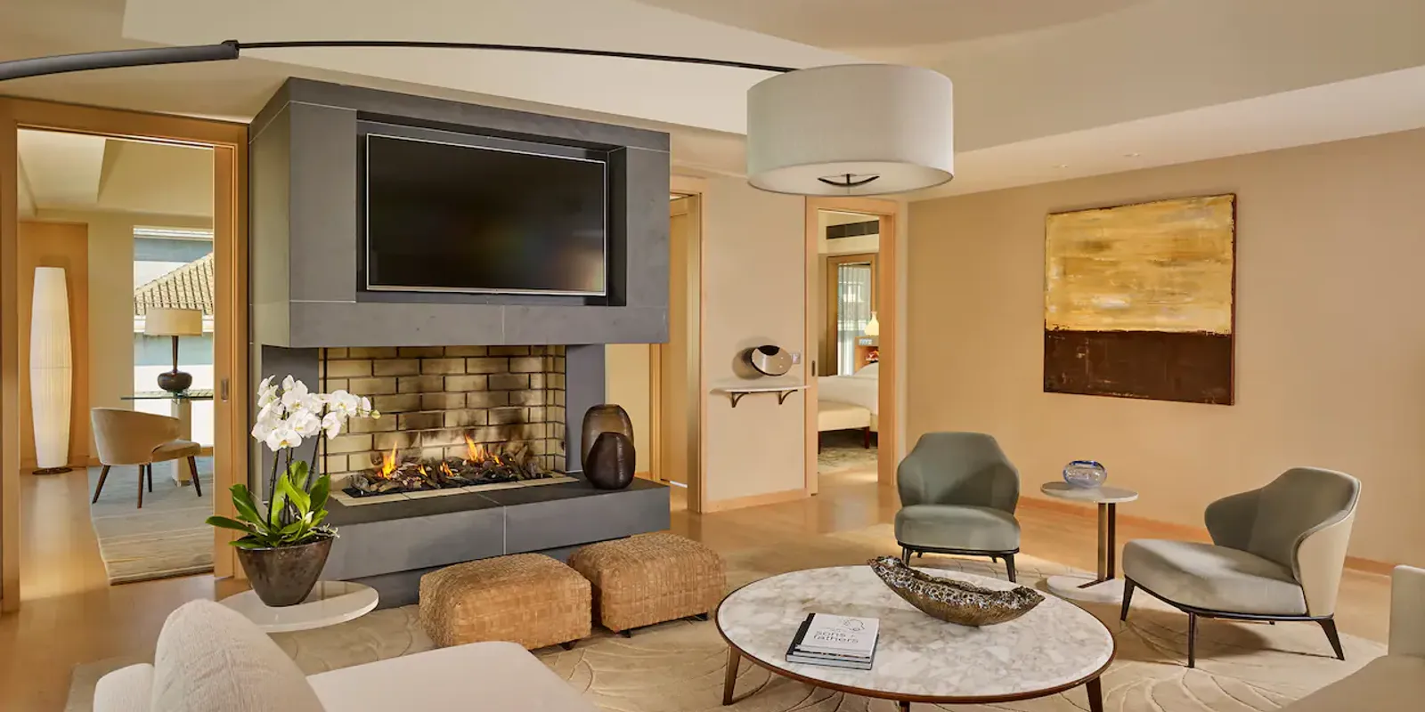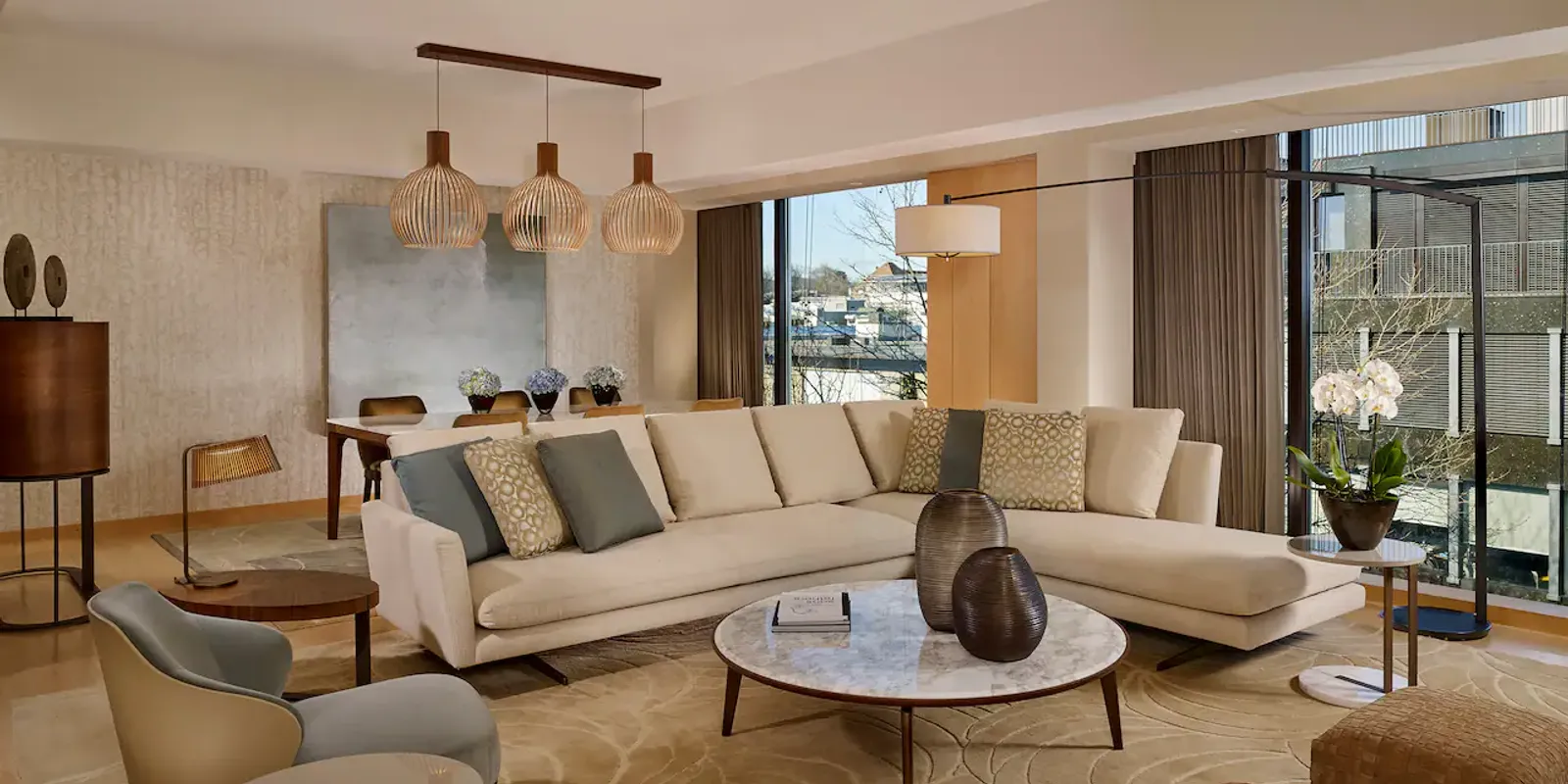 Своим высочайшим уровнем комфорта и изяществом интерьеров отель, несомненно, очарует самых требовательных постояльцев. По задумке дизайнеров, обилие зелени за панорамными окнами вносит необходимую гармонию во внутреннее пространство помещений, выдержанное в приятных пастельных тонах. Изысканные предметы декора — вазы, гравюры и оригинальные светильники — придают его люксам особый шарм.