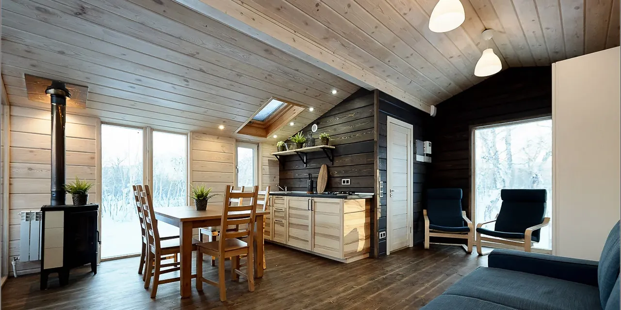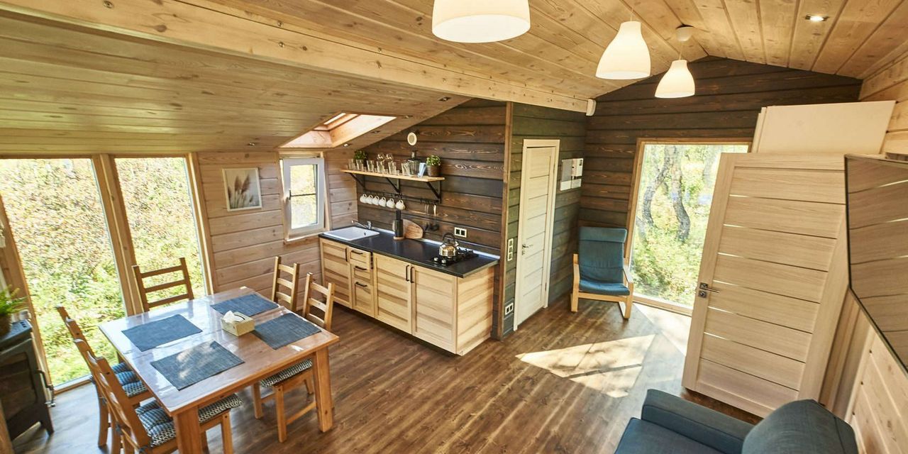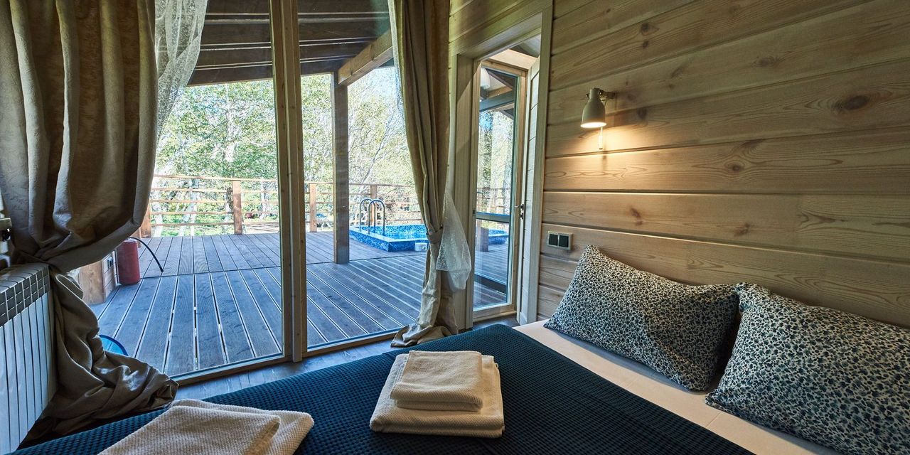 Шале оформлены в скандинавском стиле. В каждом — одна или несколько спален, кухня и гостиная зона, терраса с индивидуальным термальным бассейном. Через панорамные окна открываются фантастические виды на лес и горные вершины.