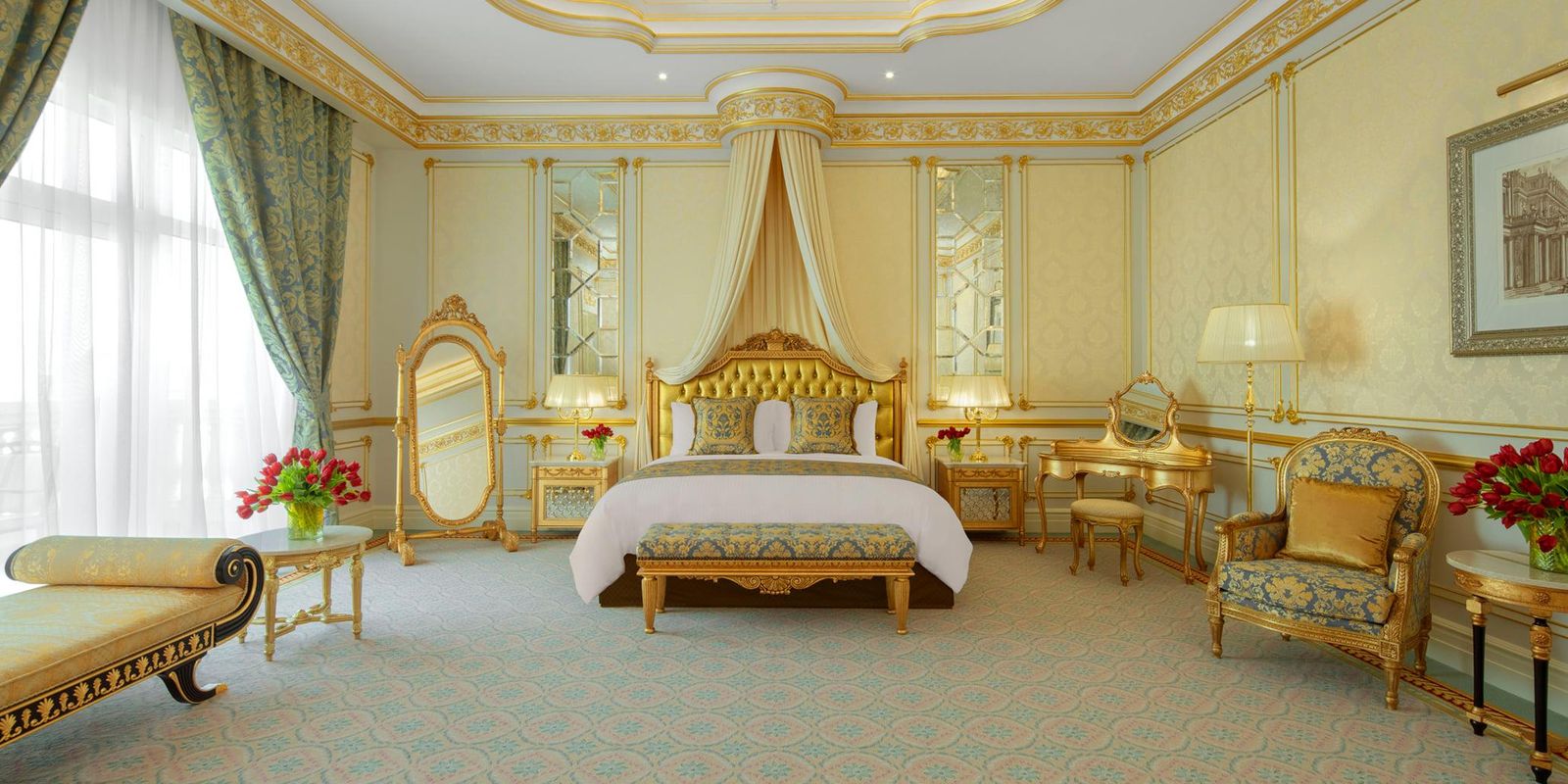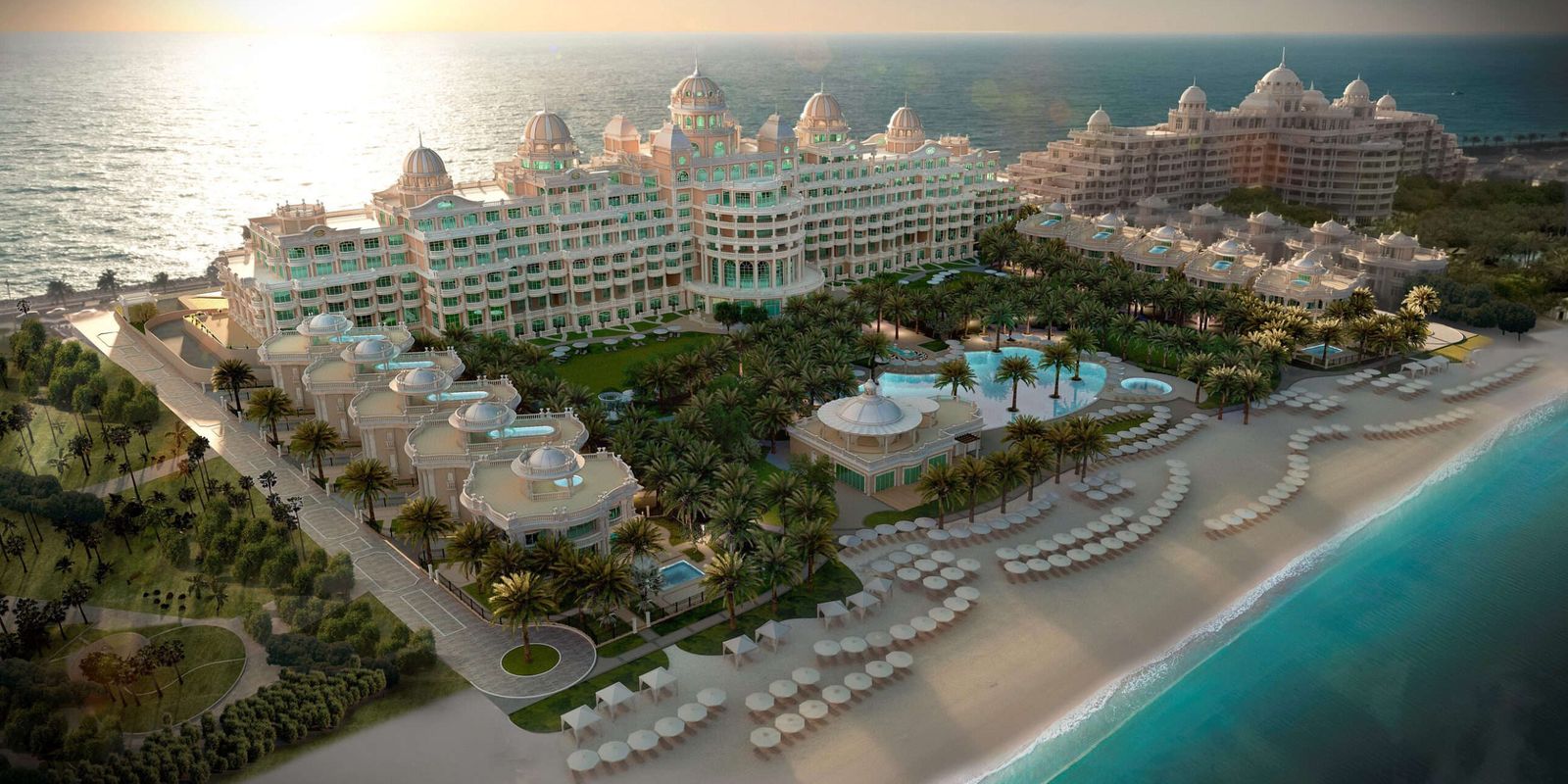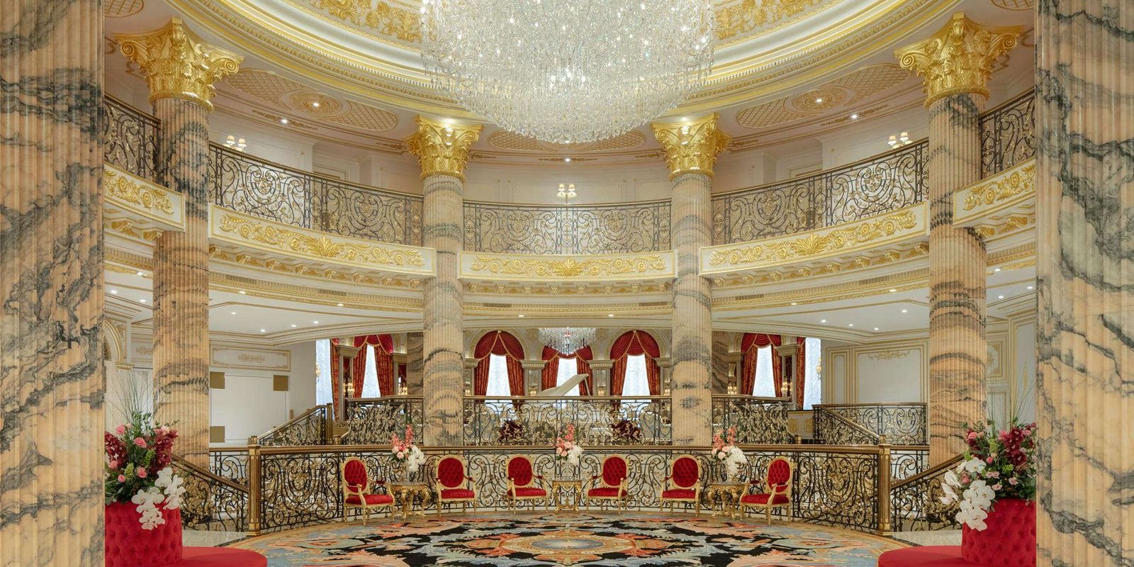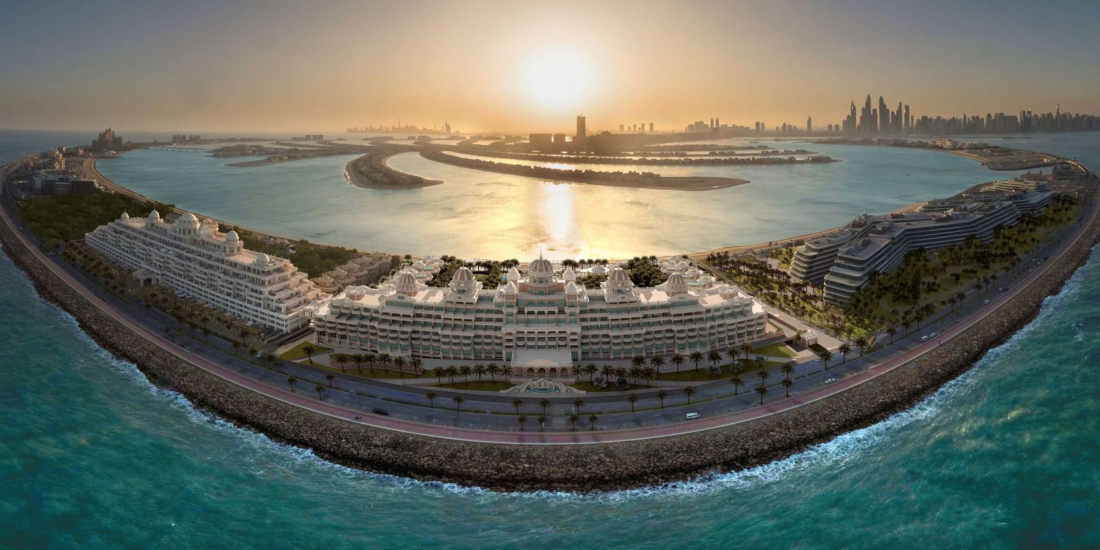 Raffles The Palm Dubai расположен на западном полумесяце Пальмы Джумейра — в тихой части архипелага с прямым видом на горизонт Дубая. Отель занимает здание в стиле европейских дворцов — с позолоченными лепными потолками, мраморными галереями и антикварной мебелью, выполненной по эскизам итальянских мастеров. Интерьеры оформлены в тёплой цветовой гамме с барочными акцентами, а в лобби гостей встречает рояль Bösendorfer в индивидуальном исполнении. Просторные террасы обращены к пляжу с белым песком, протянувшемуся вдоль всей территории.
