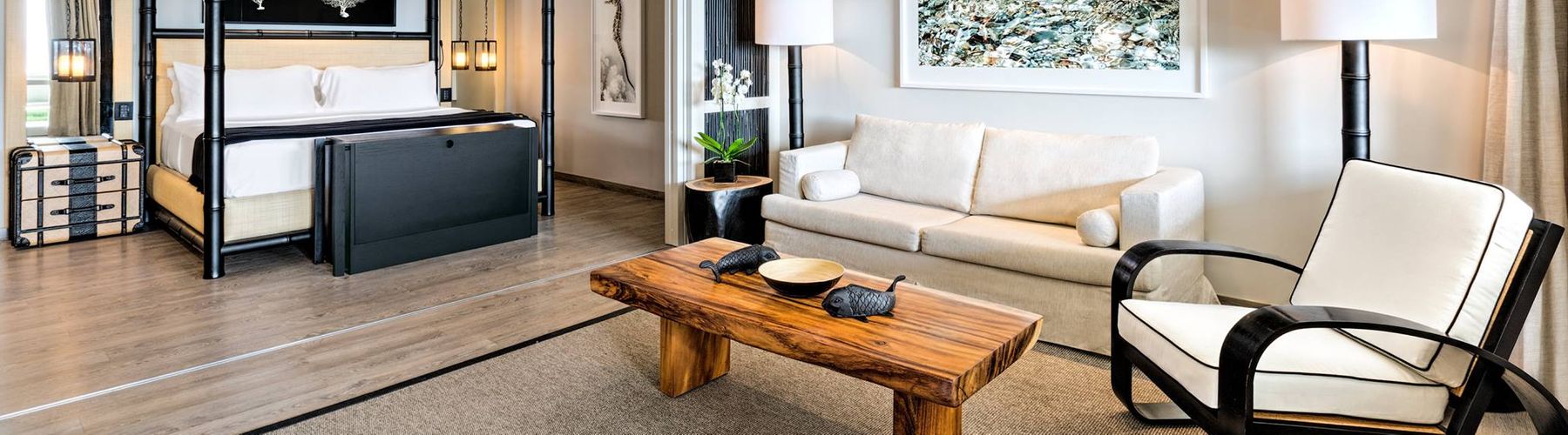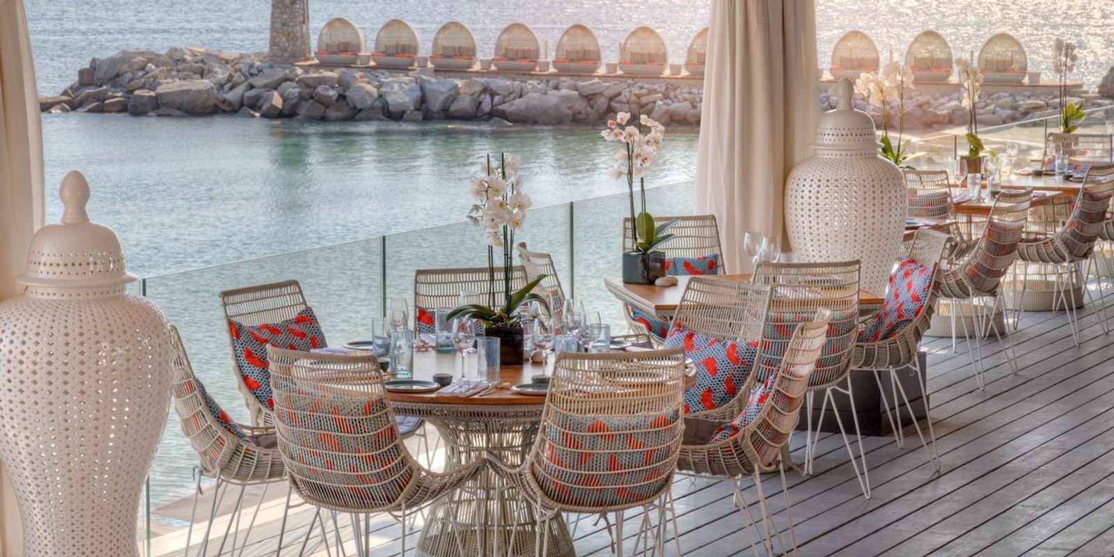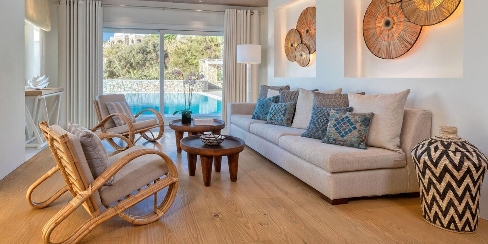Здесь 105 номеров и сьютов и 13 вил, в каждой — от двух до семи спален и собственный бассейн. В интерьерах — тёплые тона, натуральные дерево и камень и дизайнерская мебель.