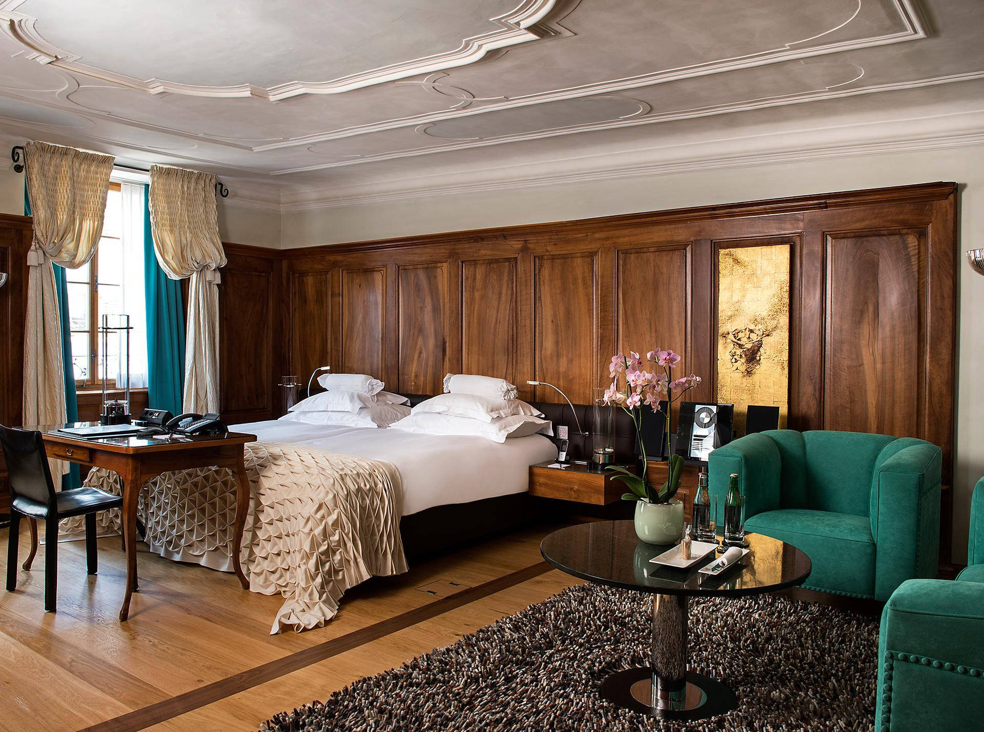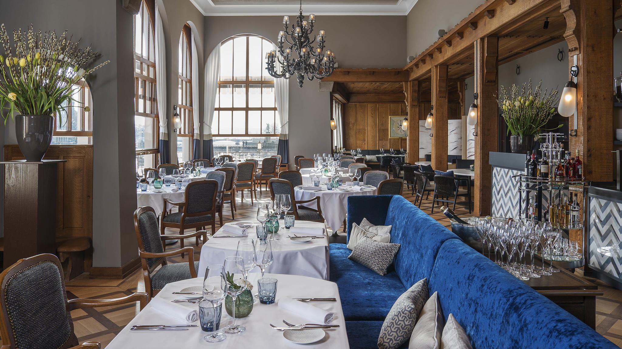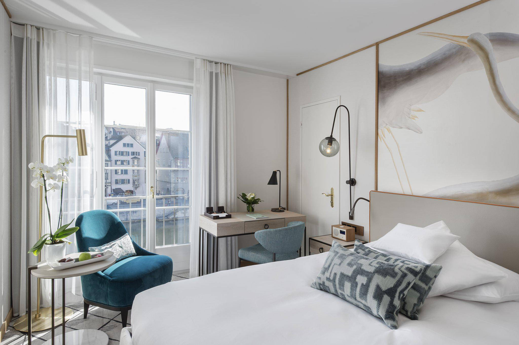 К услугам гостей — номера и сьюты с изумительными видами на реку Лиммат и Старый город, ресторан Rôtisserie, где в летний сезон открыта терраса с видом на реку и храм Гроссмюнстер, бар, кафе и сигарный салон.
