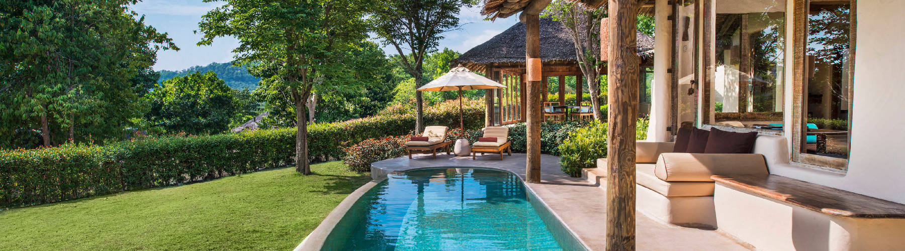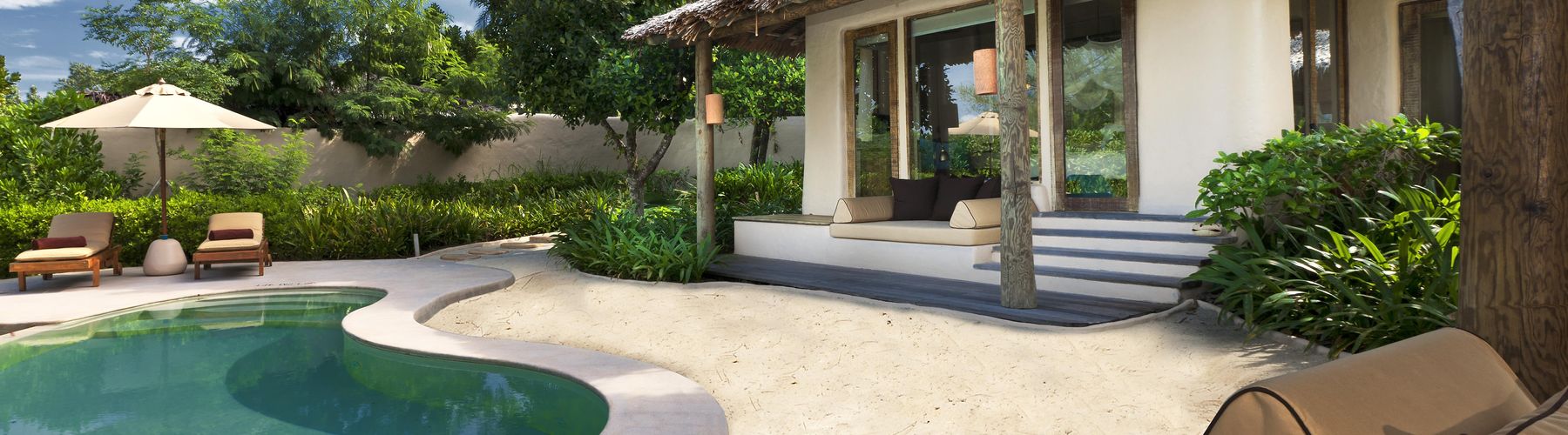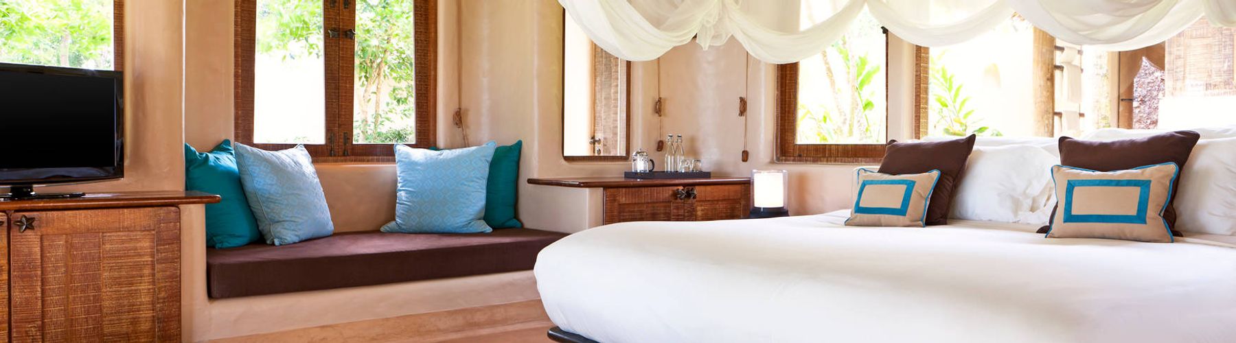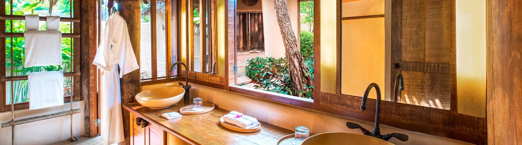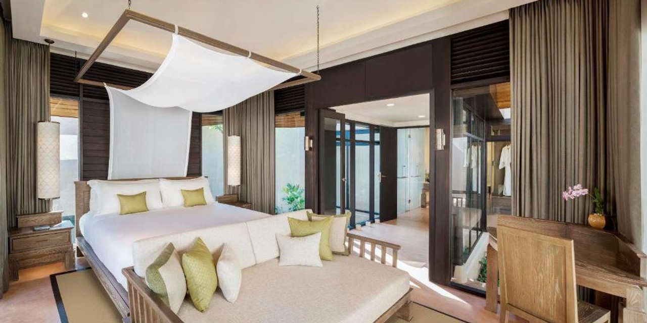 Просторные виллы (450 кв. м) выполнены в традиционном тайском стиле: мебель из ценных пород дерева, прохладные каменные полы, простые светлые тона (их дополняют оттенки голубого, лазурного и шоколадного в интерьере). Высокие потолки, огромные окна, обилие пространства, света и воздуха — все для наслаждения тропической природой.