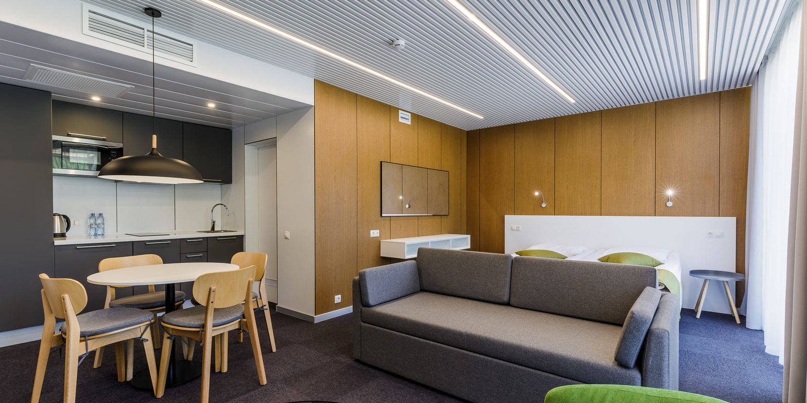 Номера двухэтажного гостиничного комплекса отличаются уютом и оптимальной функциональностью внутреннего пространства. Индивидуальные апартаменты класса «Студия» представляют собой более свободное планировочное решение. Номера оборудованы всем необходимым для комфортного отдыха. В каждом — удобные широкие кровати, современная мебель, телевизор, холодильник и ванная комната с качественными туалетными принадлежностями.