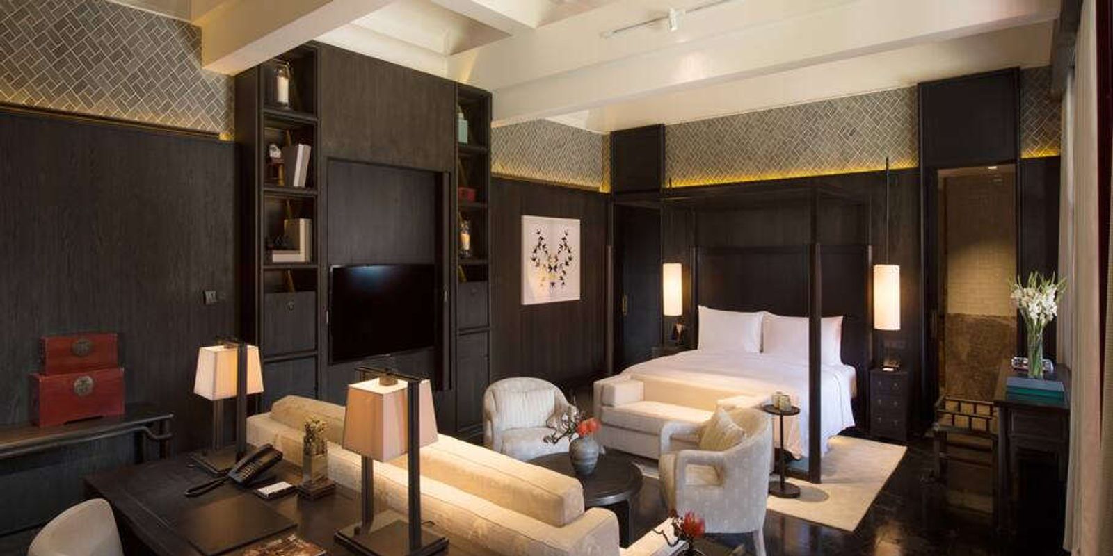 Здесь превосходно всё: огромные спальни со стенами сучжоуского шёлка, отделанные золотистым мрамором коридоры, произведения искусства на стенах. Гостям, ищущим особого уединения, предлагаются студии Hutong и одноимённый президентский люкс — роскошные апартаменты в двух виллах во внутреннем дворе.