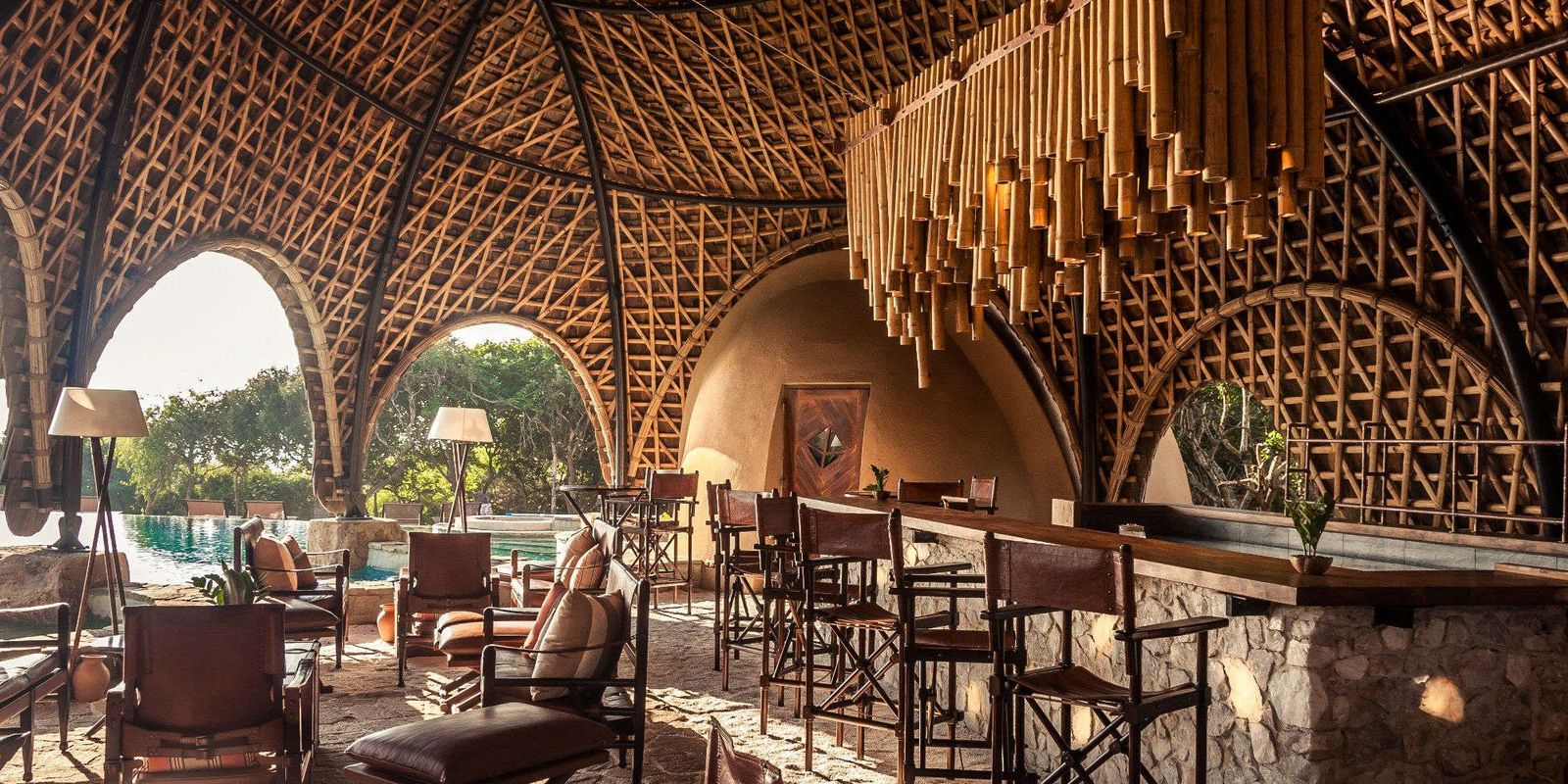 Искусственные сооружения органично вписываются в окружающий ландшафт, благодаря применению тщательно подобранных натуральных материалов и уникальному дизайну. Использование арочных тканевых конструкций позволяет каждой из 28 палаток принимать форму и цвет камней и валунов, разбросанных поблизости, в то время как продуманная планировка в форме отпечатка лапы леопарда намекает на самого известного жителя этого района.