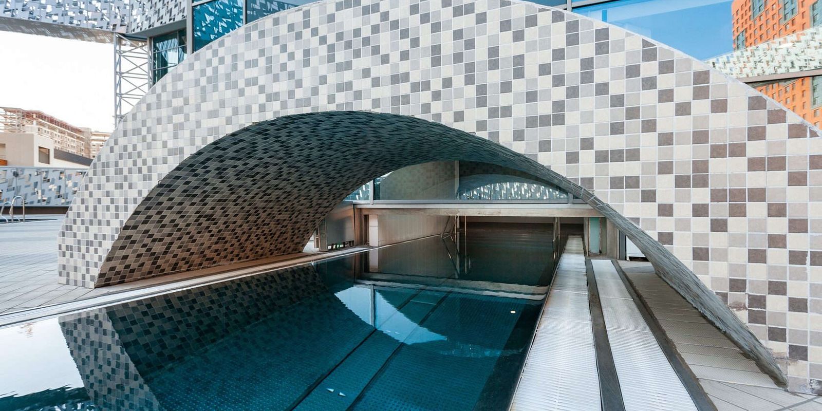 Открытый бассейн — круглогодичный с подогревом, имеет пять дорожек и зону «мелкой воды» глубиной 1,2 м для занятий аквафитнесом. Вода очищается фильтрами и системой озонирования.