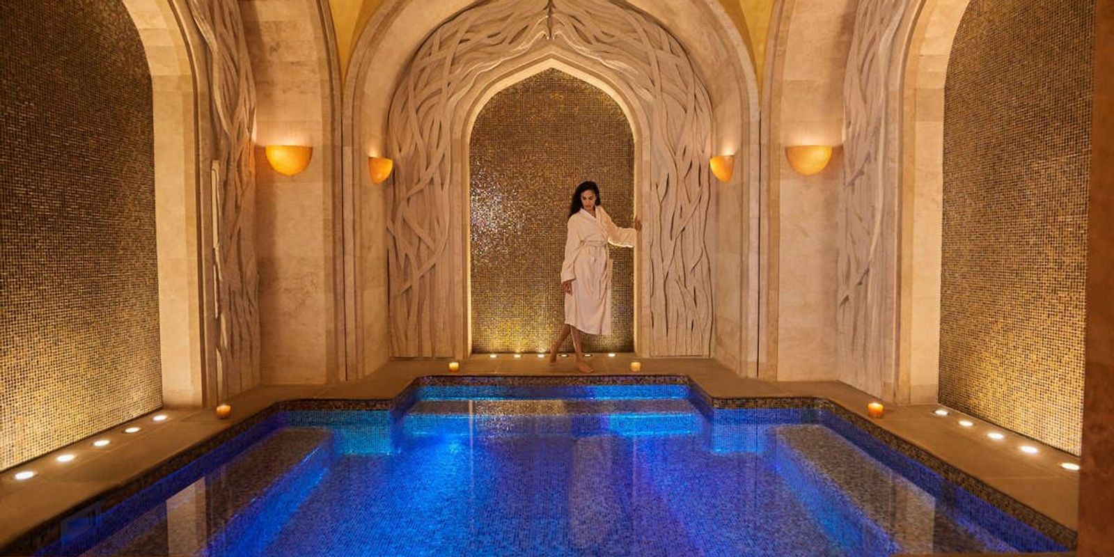 Бассейн в спа-центре, отдаленный ониксом и мозаикой четырех оттенков, окружен мерцающими светильниками – с этой красоты начинается путь к самотрансформации и целостному исцелению. Предлагается следующий маршрут: гидротерапевтический бассейн, снежный фонтан, ароматерапевтический пар, традиционная сауна, один или два из ритуалов, уход за лицом и легкая трапеза на свежем воздухе.