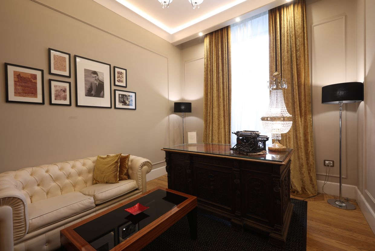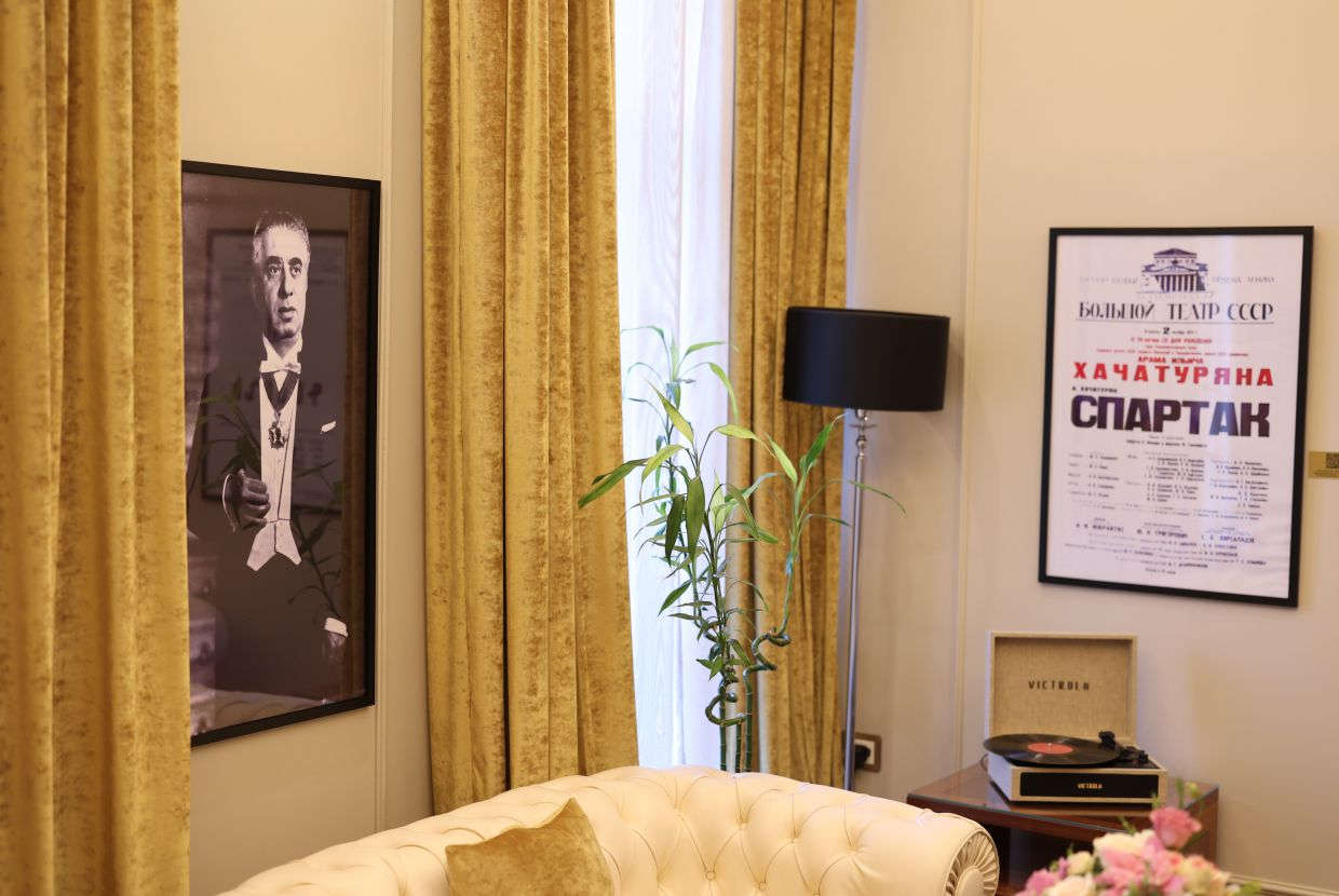 Всемирно известный композитор, дирижёр, педагог, общественный деятель. Арам Хачатурян останавливался в этой резиденции в 1935 и 1937 годах. Стены увешаны черно-белыми фотографиями гениального музыканта, обрамленными в рамы афишами к его концертам и премьерам. Для декора выбраны нейтральные оттенки песка, чтобы не нарушать «музыкальной» атмосферы места.