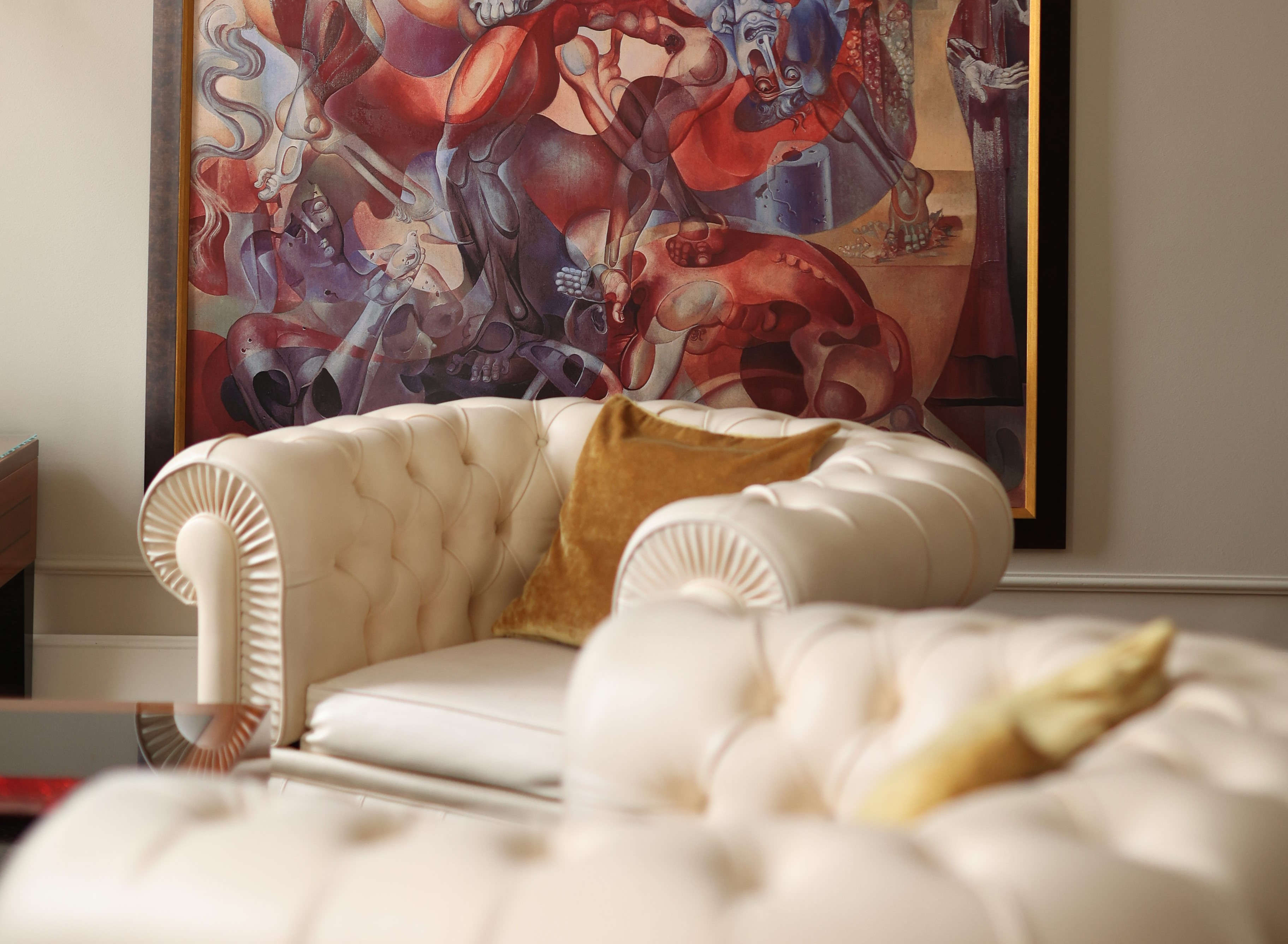 Выдающийся скульптор, современный художник и основатель движения «Живопись в пространстве» Ерванд Кочар жил в этом элегантном люксе с 1928 по 1935 год. Базовые цвета в дизайне – белый и песочно-желтый, локальные всплески алого – банкетка, стеганый пуф. На стенах – картины мастера и постеры афиш с его выставок. 41 квадратный метр – спальня, гостиная, ванная комната, балкон в отличными видами на столицу.