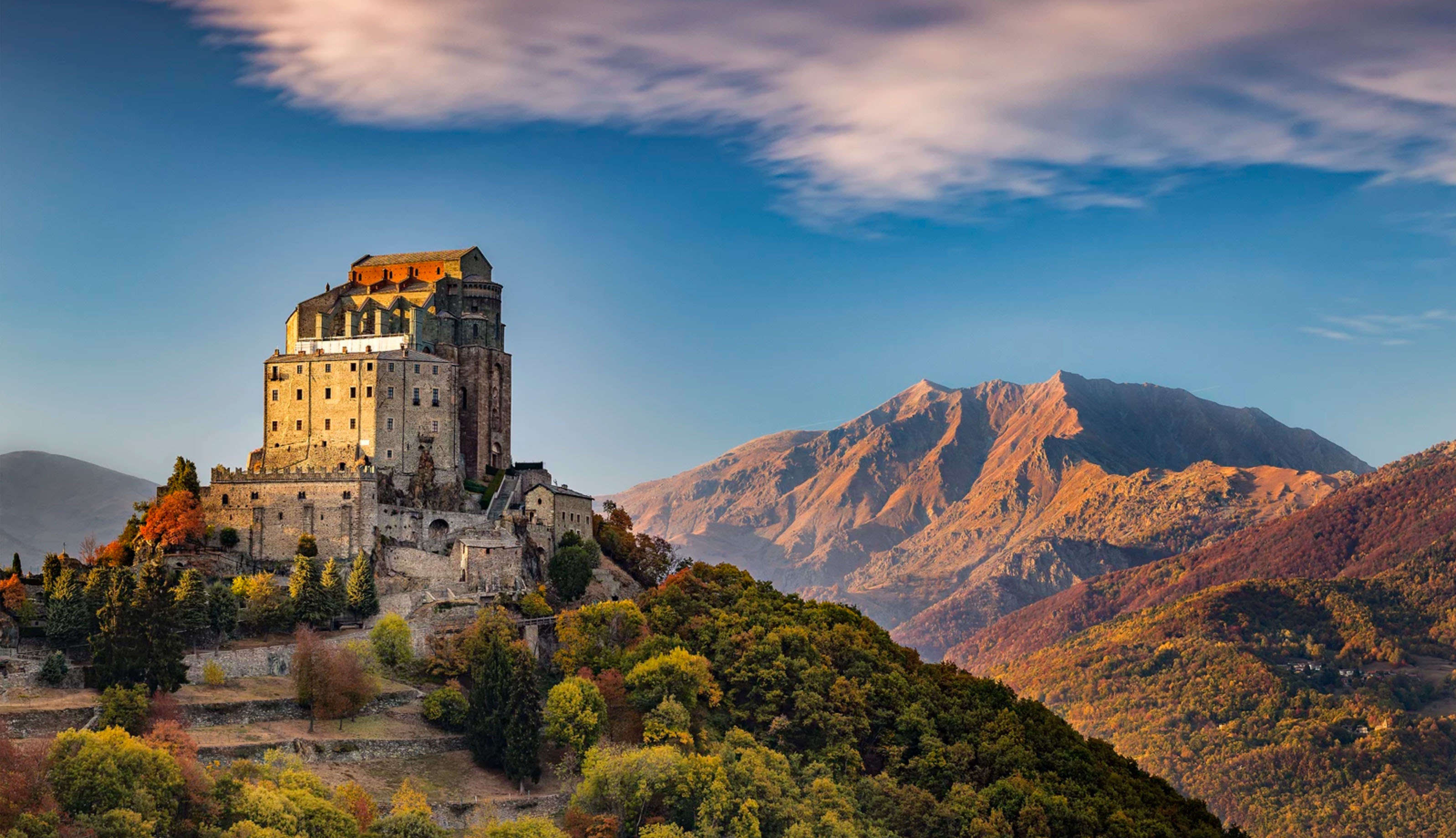 Древнее аббатство Сакра-ди-Сан-Микеле было построено между 983 и 987 годами на вершине горы Пирчириано. Оно посвящен культу Архангела Микеле, защитника христианского народа, и принадлежит к паломническому маршруту, который проходит от Сен-Мишеля, Франция, до Монте-Сант-Анджело в Апулии, Южная Италия.