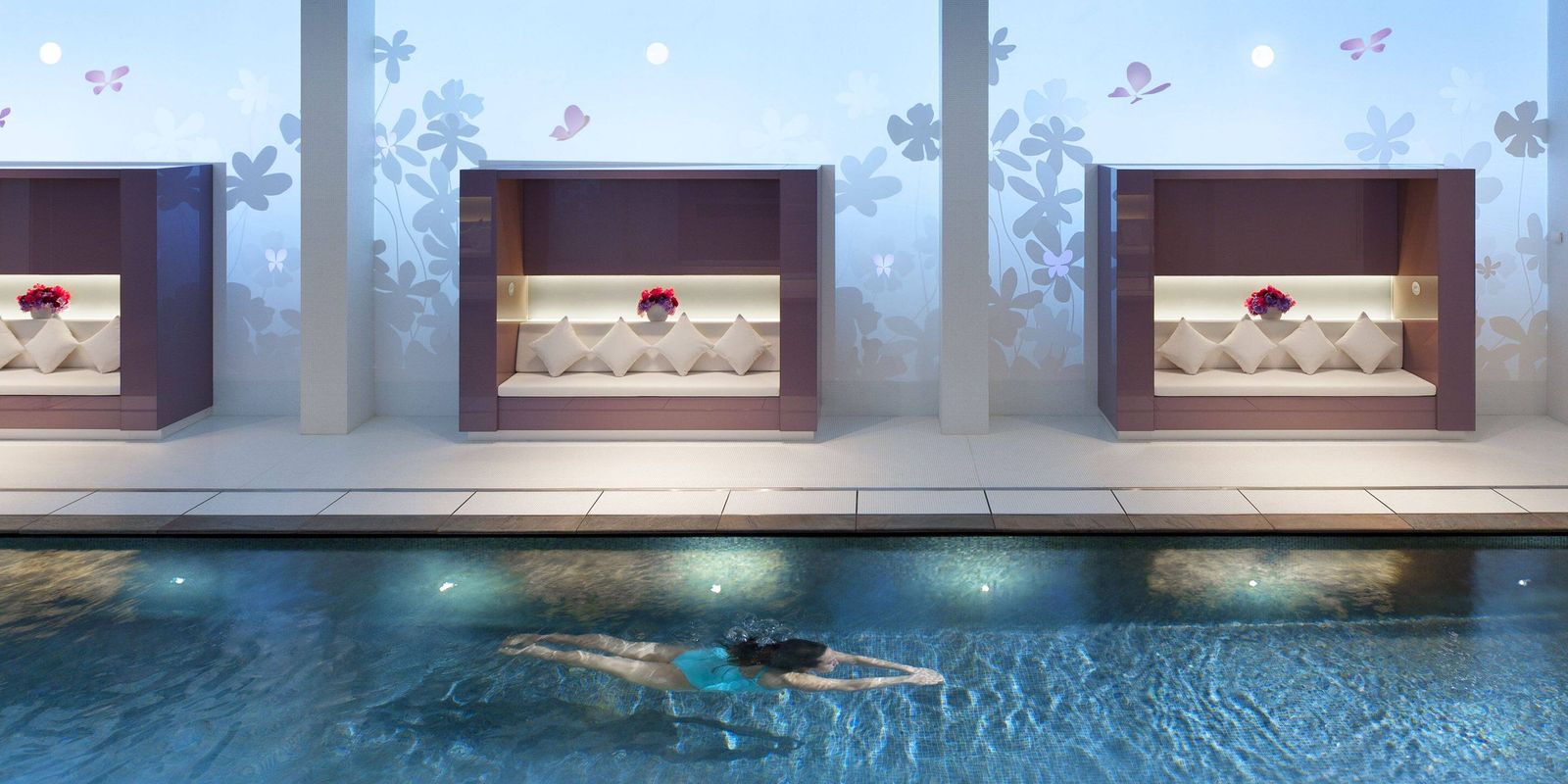 Здесь также есть 14-метровый плавательный бассейн, травяная парная, фитнес-центр и бутик.