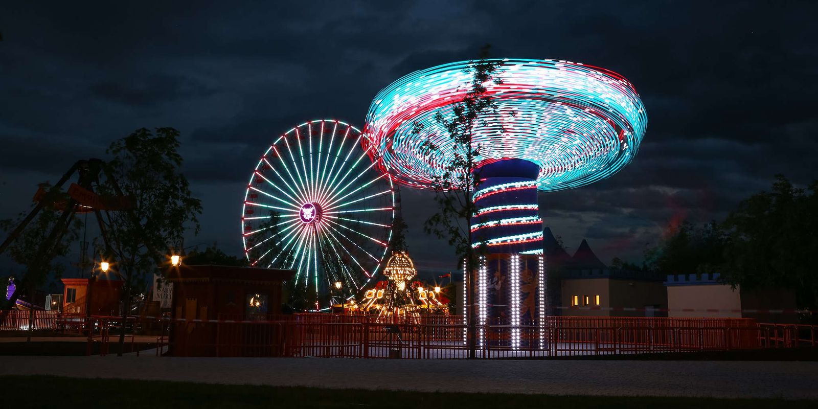 В парке есть множество детских, семейных и захватывающих аттракционов, как в закрытом помещении, так и на открытом воздухе, в том числе 4 горки и огромная двухэтажная игровая площадка.