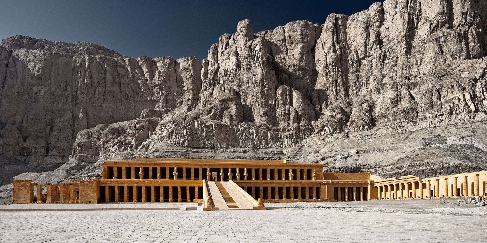 Этот храм, возвышающийся над высокими зубчатыми скалами в Дейр-эль-Бахари, обладает четкостью и симметрией, которые противоречат его возрасту, поскольку он был построен более 3000 лет назад.