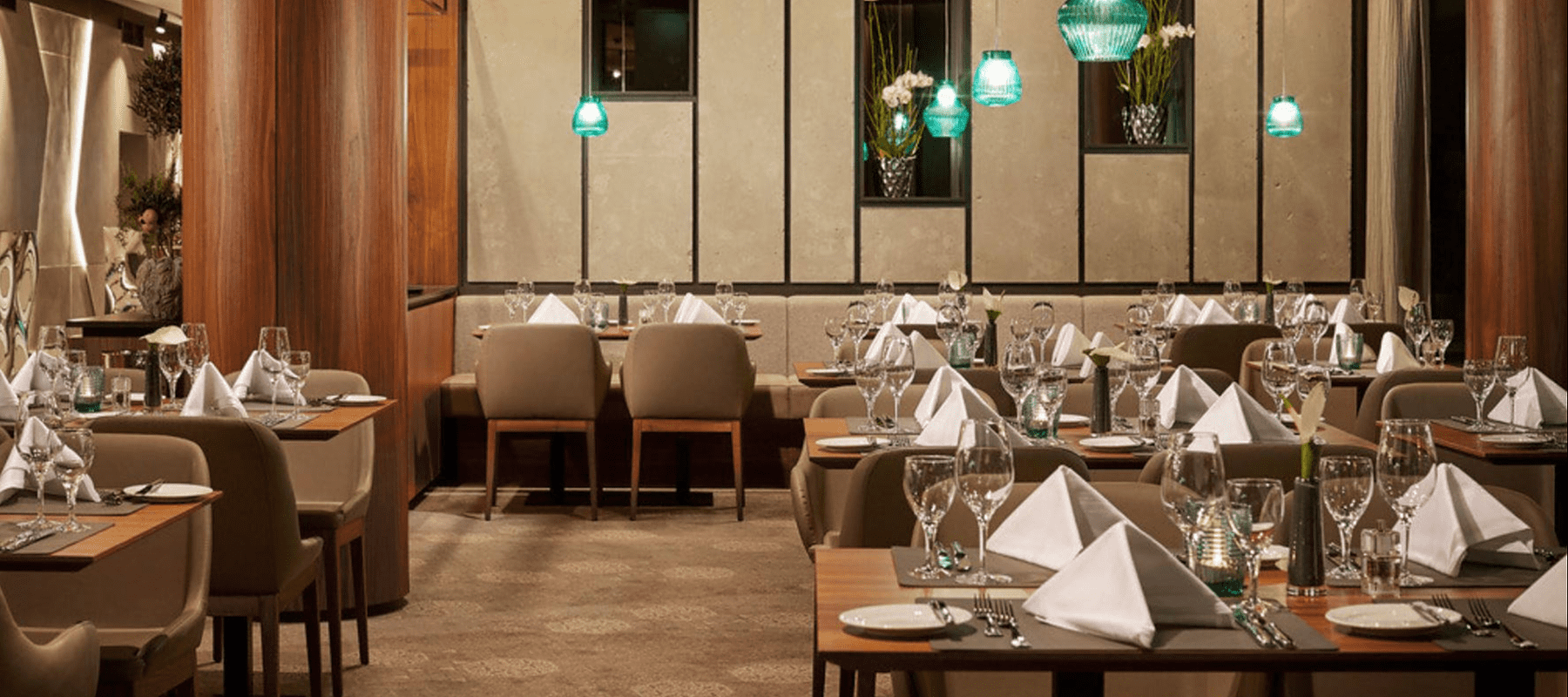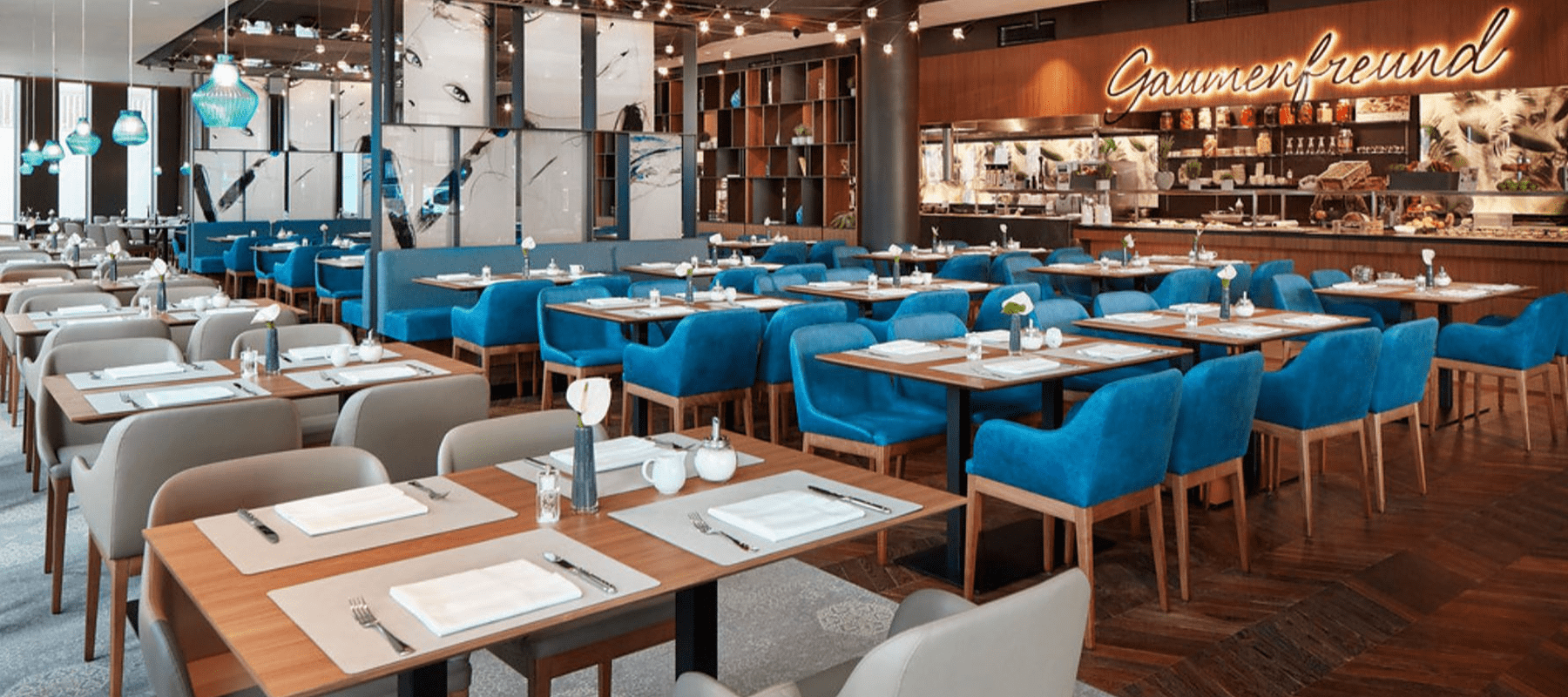 Интерьер заведения выполнен в современном стиле с большим количеством дерева в отделке, которое умело гармонирует с акцентами яркого синего цвета.