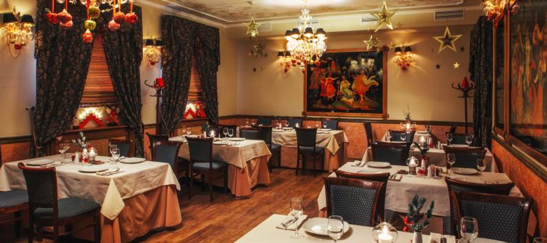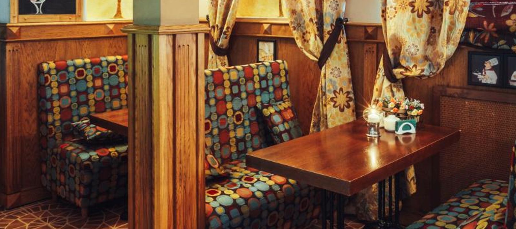 Интерьер заведения напоминает гостиную купеческого дома. Тяжелые портьеры с цветочным орнаментом приглушают свет, льющийся из окон, создают атмосферу приятного уютного полумрака. Потолок и стены раскрашены великолепными фресками с цветочными и сельскими мотивами.