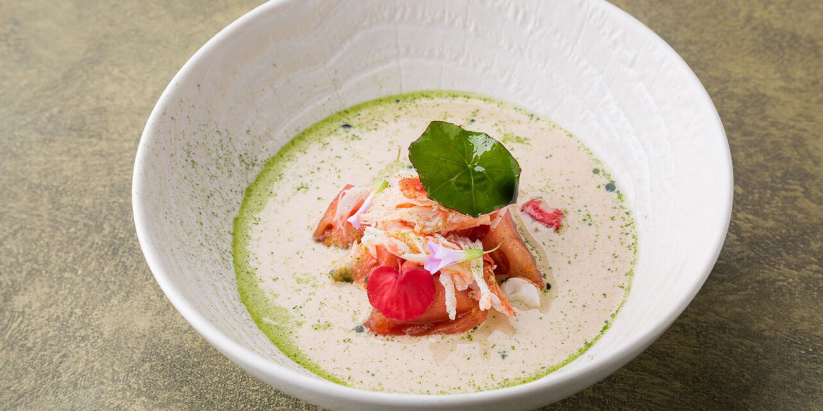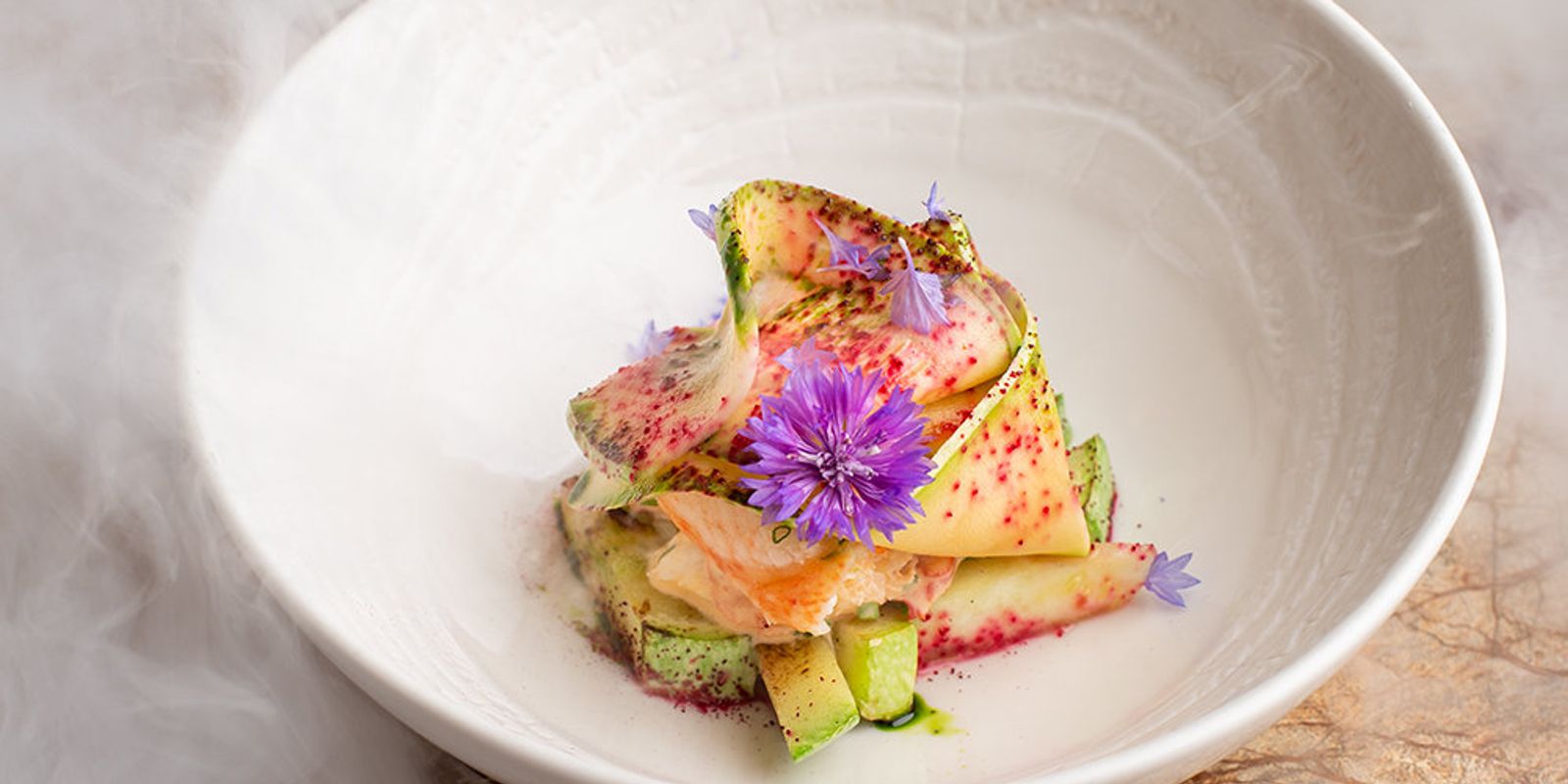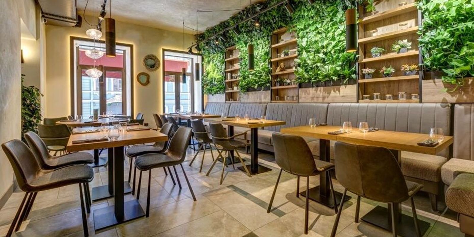 В меню представлены классические и авторские блюда средиземноморской кухни: страчателла с икрой, паштет цесарки, домашний хлеб с маслом, яйцом и чёрным чесноком, вишневый гаспачо, бульон из мидий, капустный суп с уткой, кролик с гречневым муссом, лимонный тарт, вашрен, «Бородино» и другие блюда.