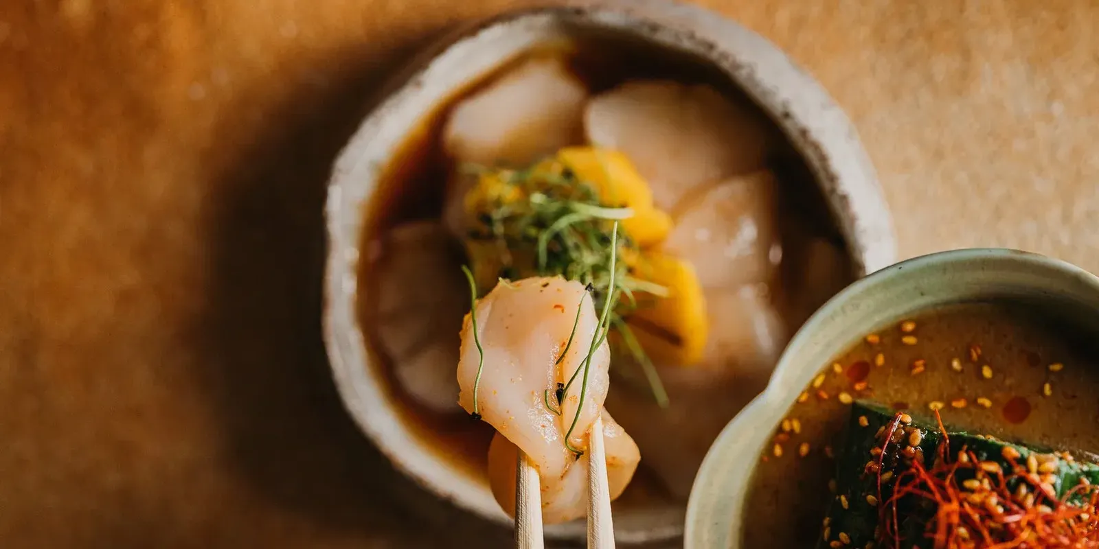 Шеф-повар представляет свой подход к идеально сбалансированной японской кухне, отдавая предпочтение простым и лаконичным сочетаниям, чтобы ничто не отвлекало от главного — качества продуктов. Он также следует традициям японских шефов, у которых учился: еда — это язык, на котором повар общается с гостями.