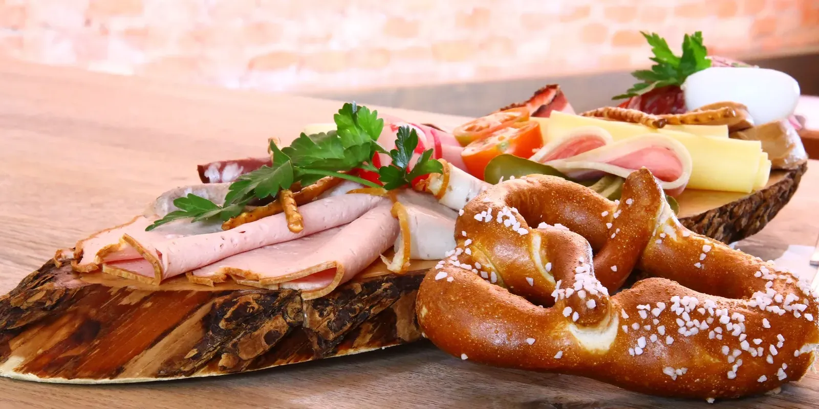 На завтрак здесь подают традиционные колбаски из телятины «вайсвурст» со сладкой горчицей и солёными кренделями «брецн» — обязательно стоит попробовать.