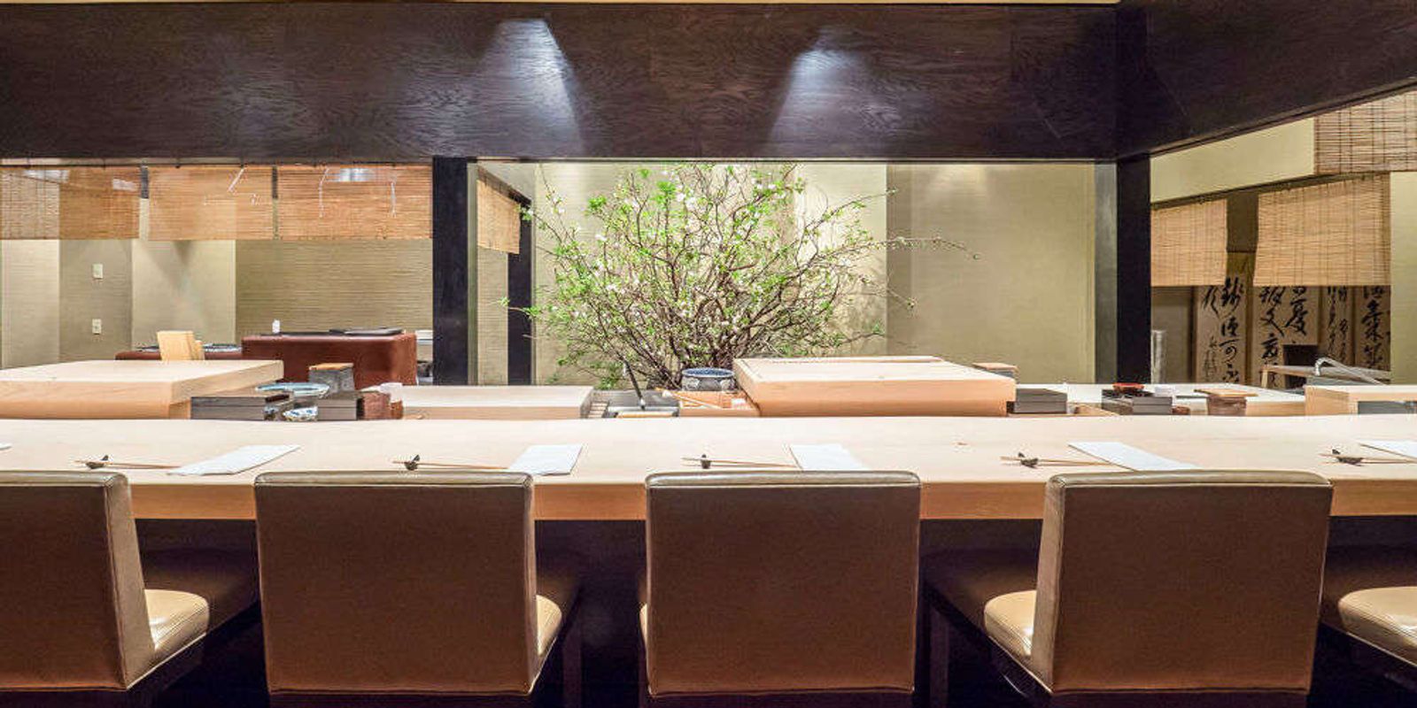 В обстановке заведения особое внимание уделено деталям по законам шибуса — ощущение по своей сути прекрасного качества с экономией форм, линий и усилий, создающих вневременное спокойствие.