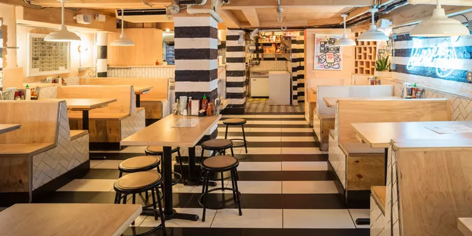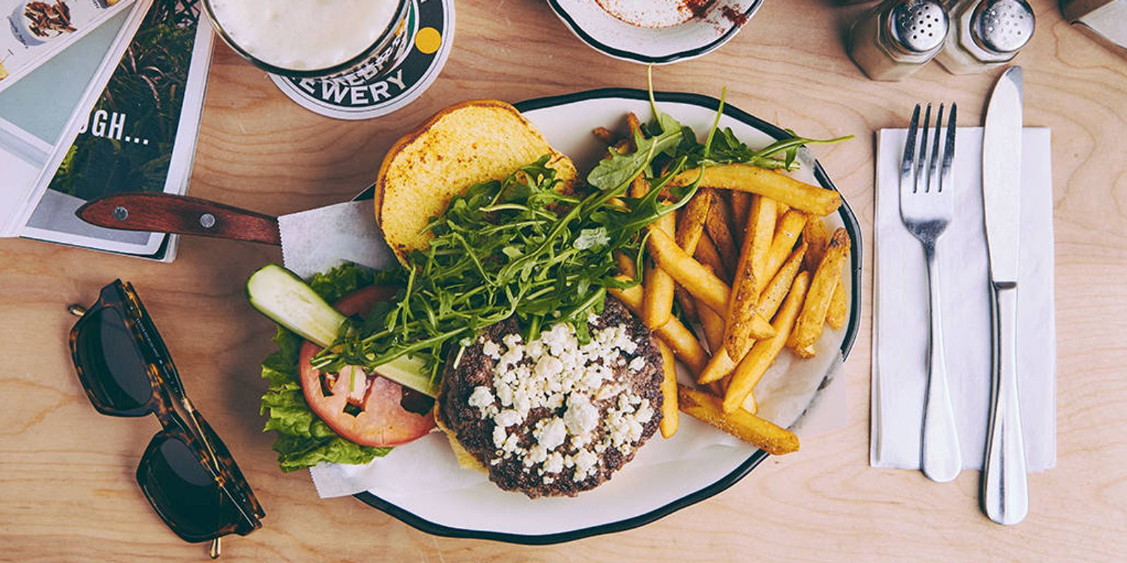 Интерьер заведения оформлен в стиле хип-хоп и рок-н-ролл старой школы. В меню представлена нескучная еда в виде гамбургеров из говядины, бизона, баранины, индейки, чоризо и фалафеля, а также гарниров, в состав которых входят терияки брокколи, хрустящая брюссельская капуста и мексиканский авокадо.