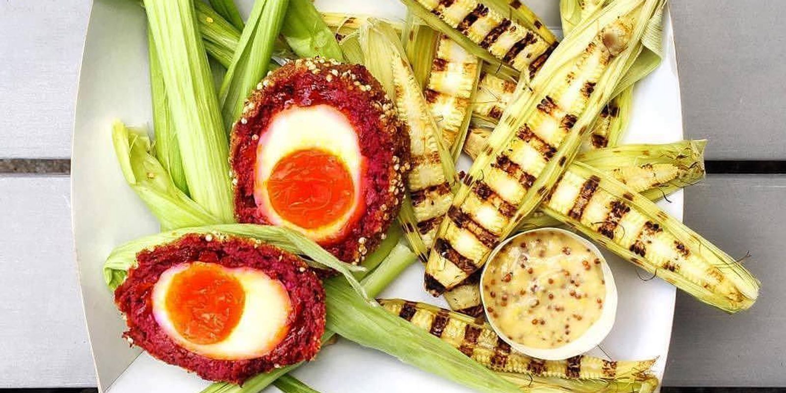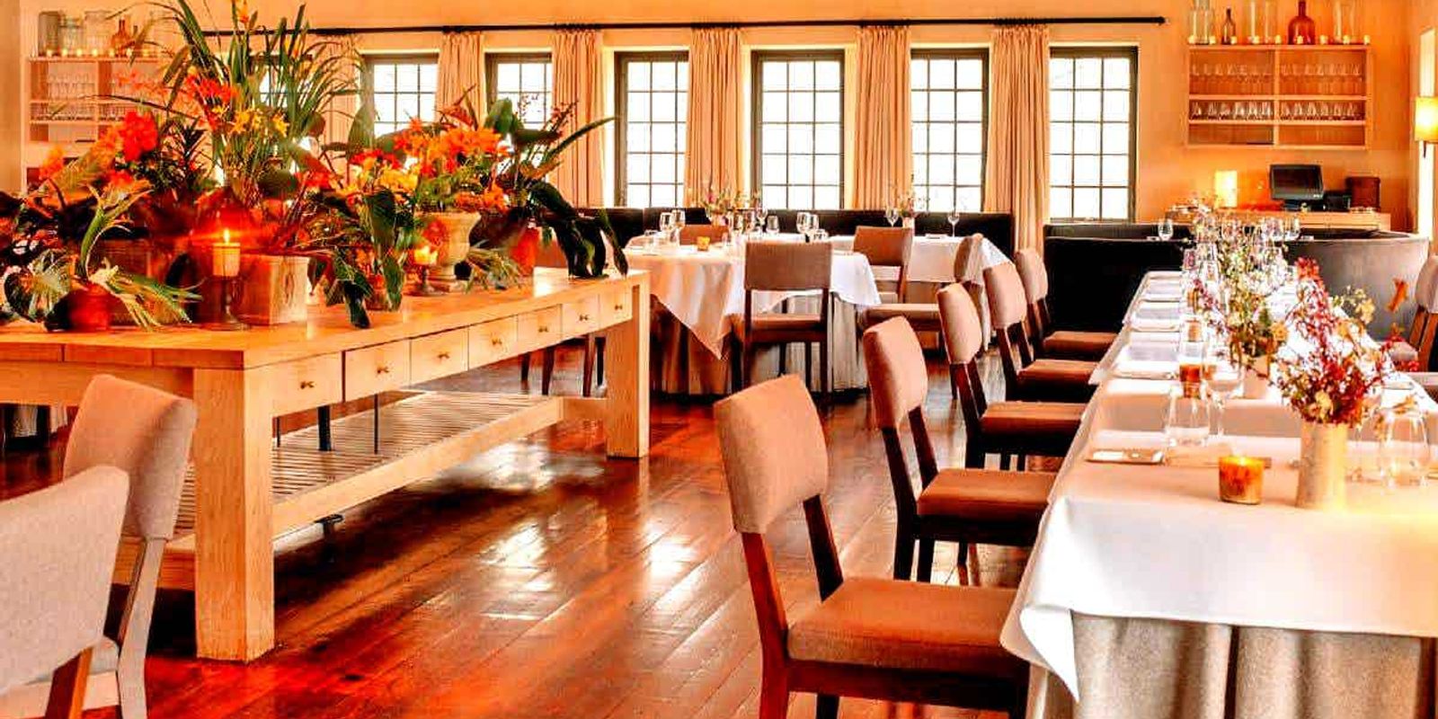 Гости заведения могут разместиться в просторном зале, который ранее служил молочной фермой. В интерьере используются теплые цвета, помещение украшено искусными композициями из цветов и овощей.