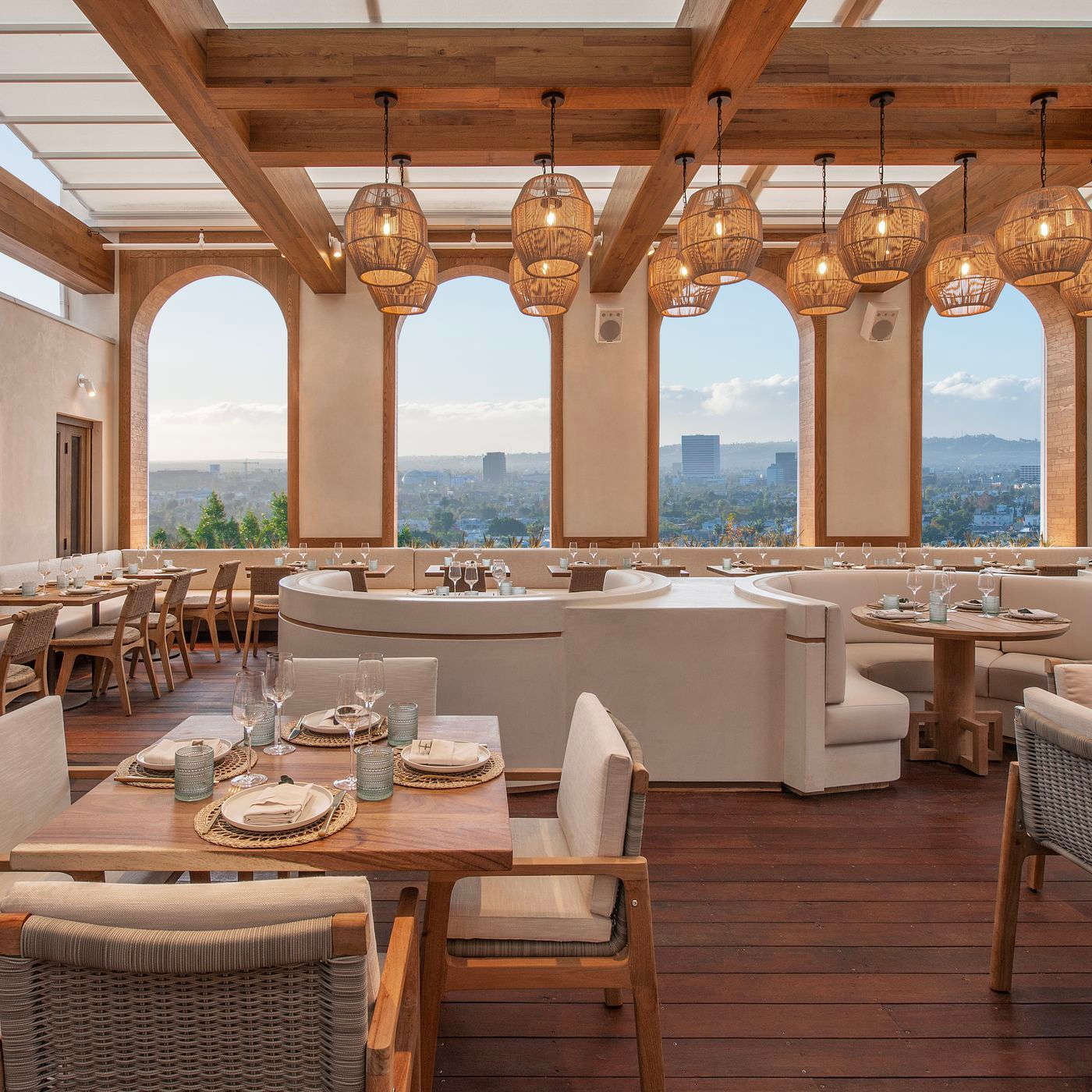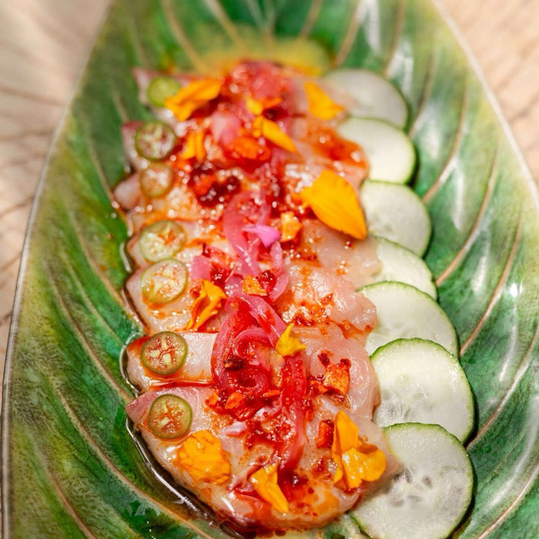 Остроумный концепт: прибрежная кухня половины мира – от Мексиканской Ривьеры до Средиземноморья. Элегантное место: в главном обеденном зале с высокими арочными окнами доминирует светлое дерево и ротанг, винтажные абажуры в форме корзинок для рыбы льют тёплый свет, цветочные композиции благоухают. В отдельном кабинете дюжина гостей может собраться за потрясающим столом из массива кедра, на открытой террасе шелестят листья пальм над столиками – и долетают запахи океана.