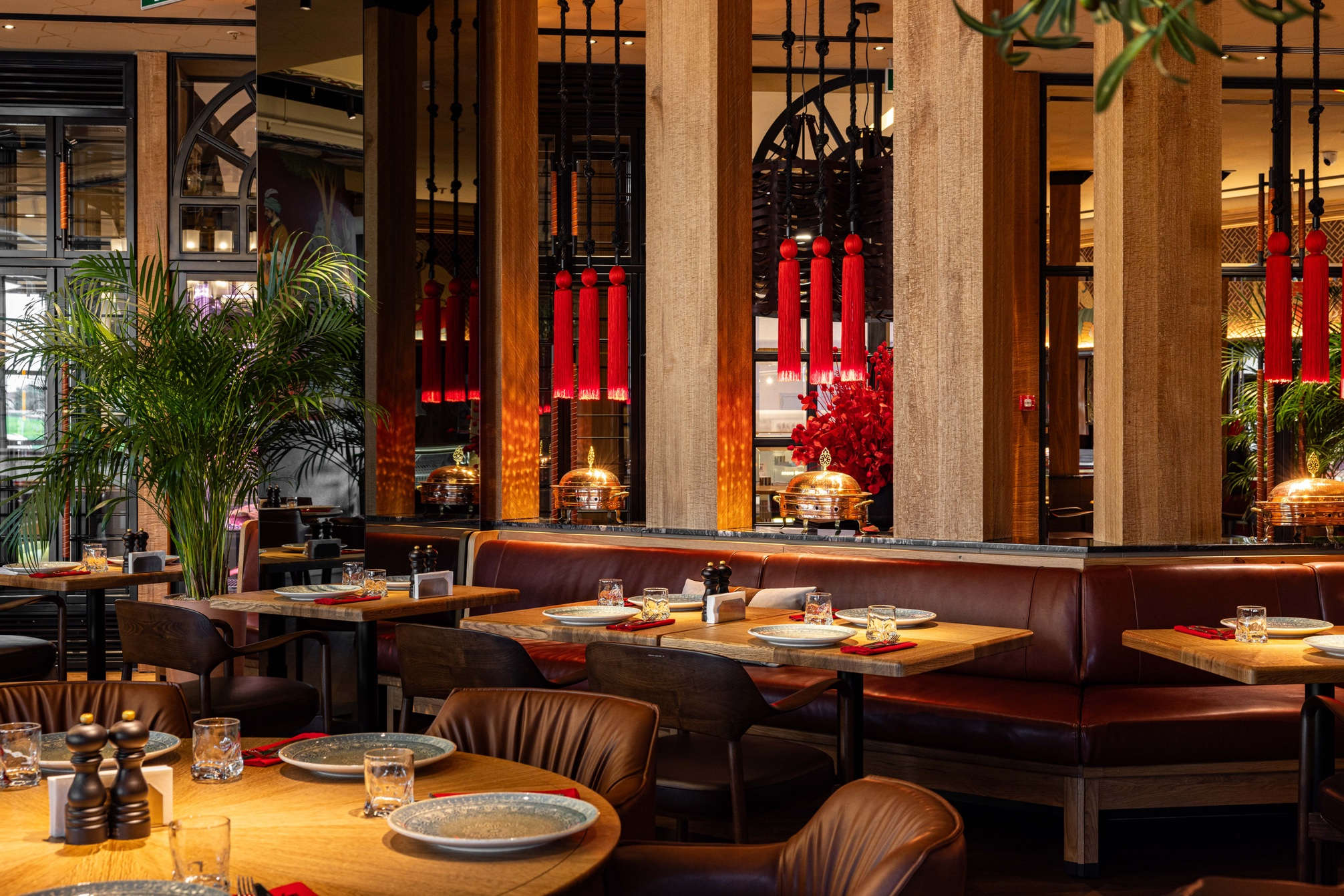 Интерьером занималась команда Krivtsova&Redina. Дизайнеры задумали перенести гостя в восточную сказку – во дворец с расписными потолками, панорамными окнами, пышной зеленью, удобными диванами с мягкими подушками, аутентичными массивными люстрами с бронзовым напылением и декоративными элементами ручной работы. Каждый уголок соответствует общей концепции: стены расписаны художниками вручную, узоры стилизованы под мозаику.