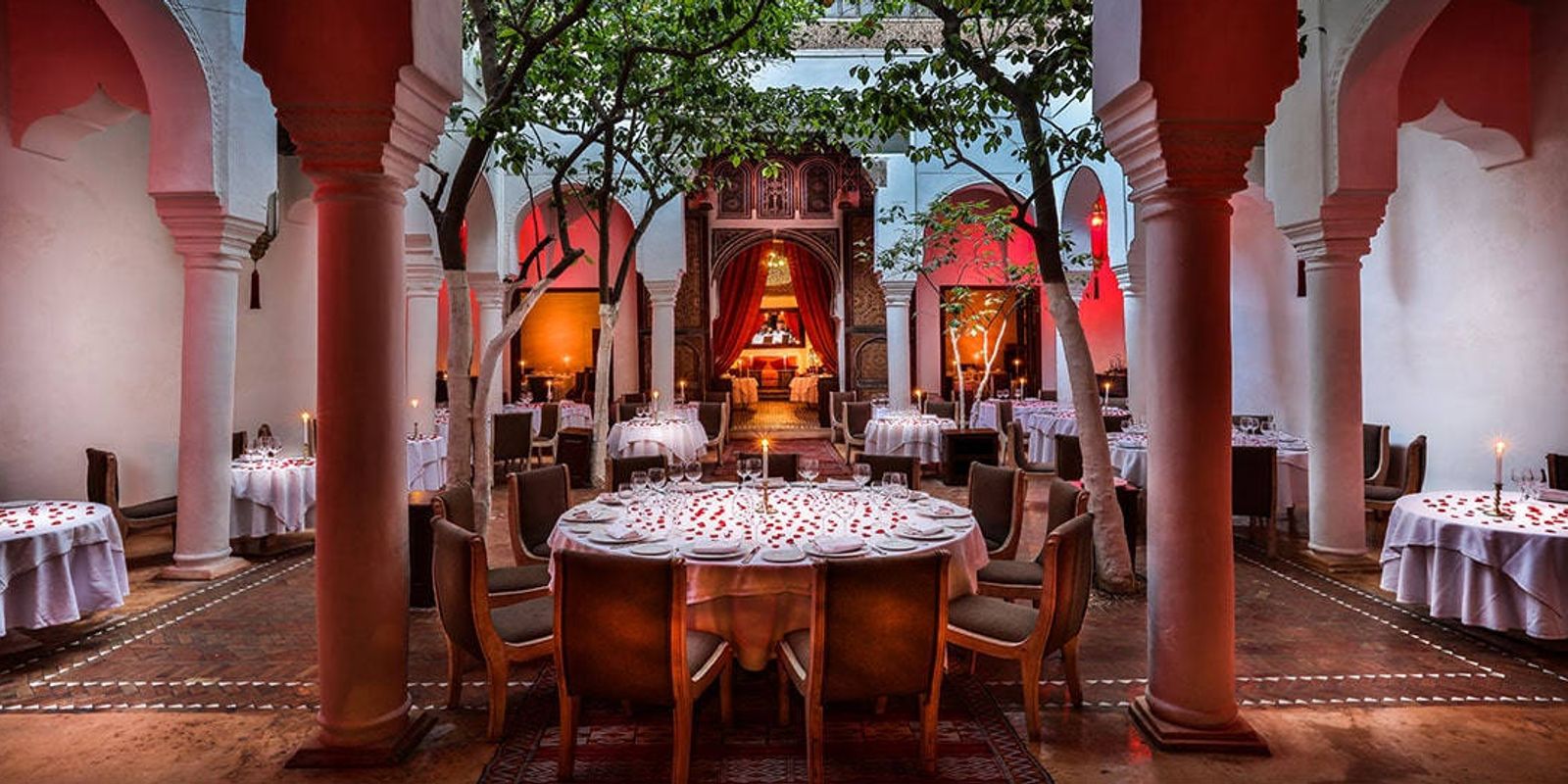 Внутреннее пространство ресторана разделено на несколько зон: есть очаровательный внутренний дворик с апельсиновыми деревьями, несколько уровней веранд, отдельный зал для курения и великолепный шатер. Вечер вам предложат начать на веранде на крыше — чтобы перед началом трапезы насладиться видами ночного Марракеша и бокалом игристого.