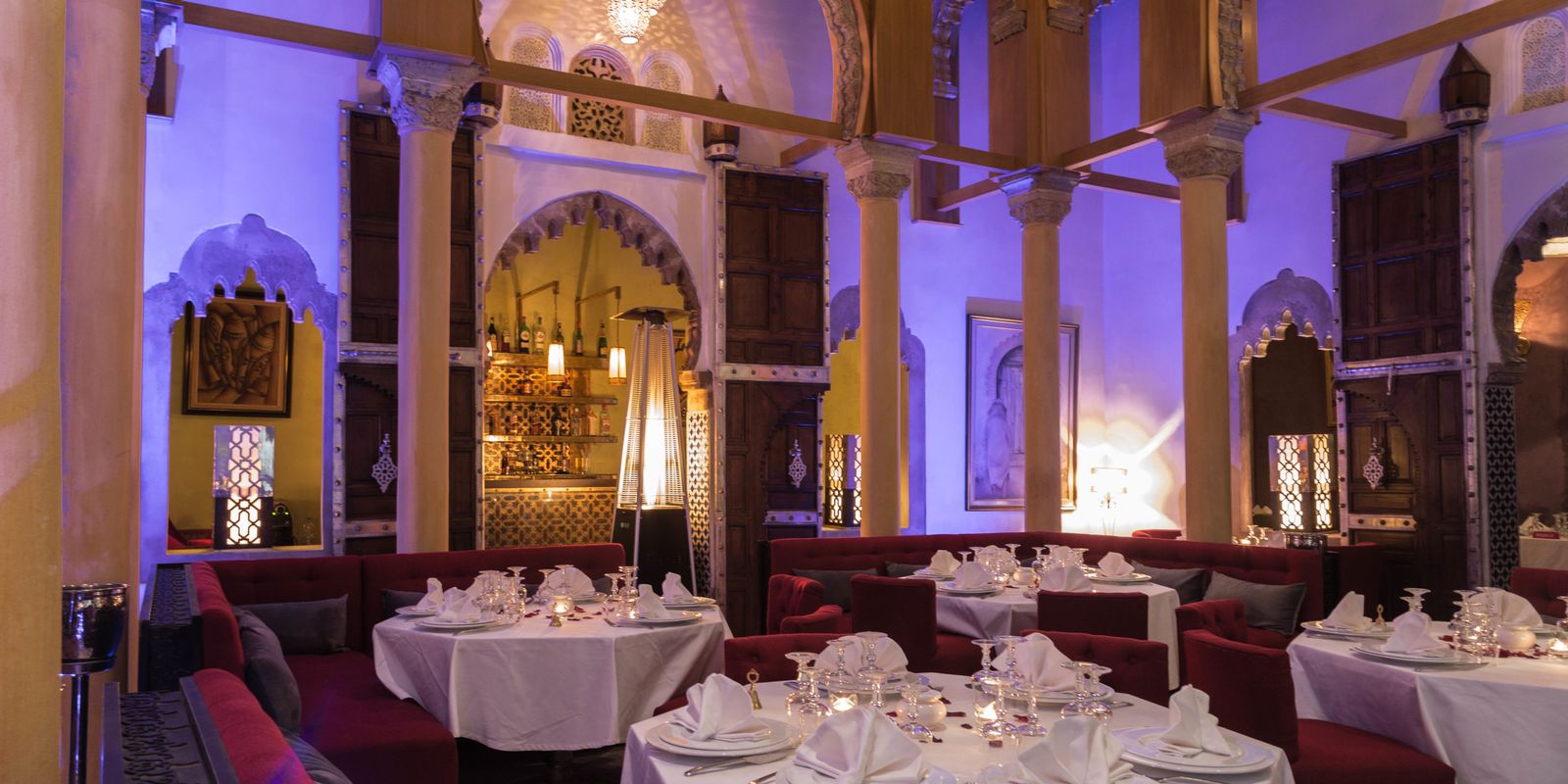 Гостей приглашают расположиться во внутреннем дворике, в ажурной тени больших мандариновых деревьев и пальм, или выбрать прохладу зала, оформленного в ярком мавританском стиле. Вечером здесь зажигают свечи и звучит живая музыка, наполняя ресторан атмосферой абсолютной арабской сказки.