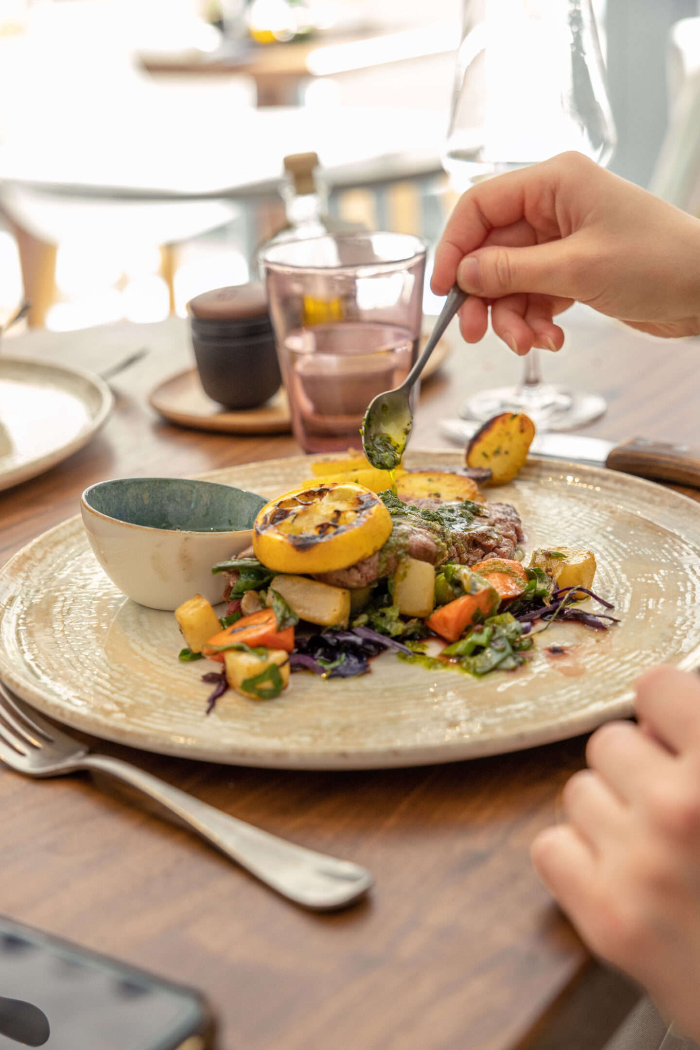 Начинают здесь с небанальных салатов – весенний с молодым одуванчиком и малиновым муссом, артишок на гриле с винегретом и лаймовой сметаной, соевый тартар с редисом, яблоками и каперсами. Далее выступают главные игроки – рыба дня из Цюрихского озера, лучшие стейки, бараньи отбивные и цыплята свободного выпаса. Среди специалитетов – кабачки-гриль с жареным фундуком и рикоттой и куриная грудка со сладкой кукурузой. Разнообразие соусов.