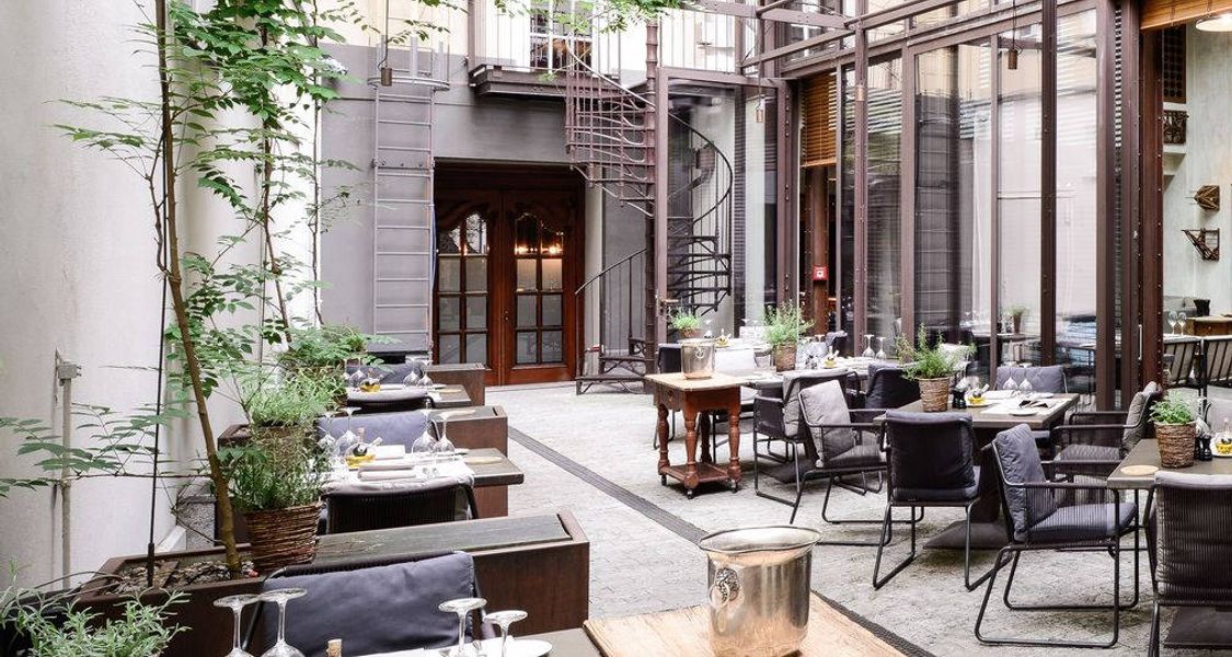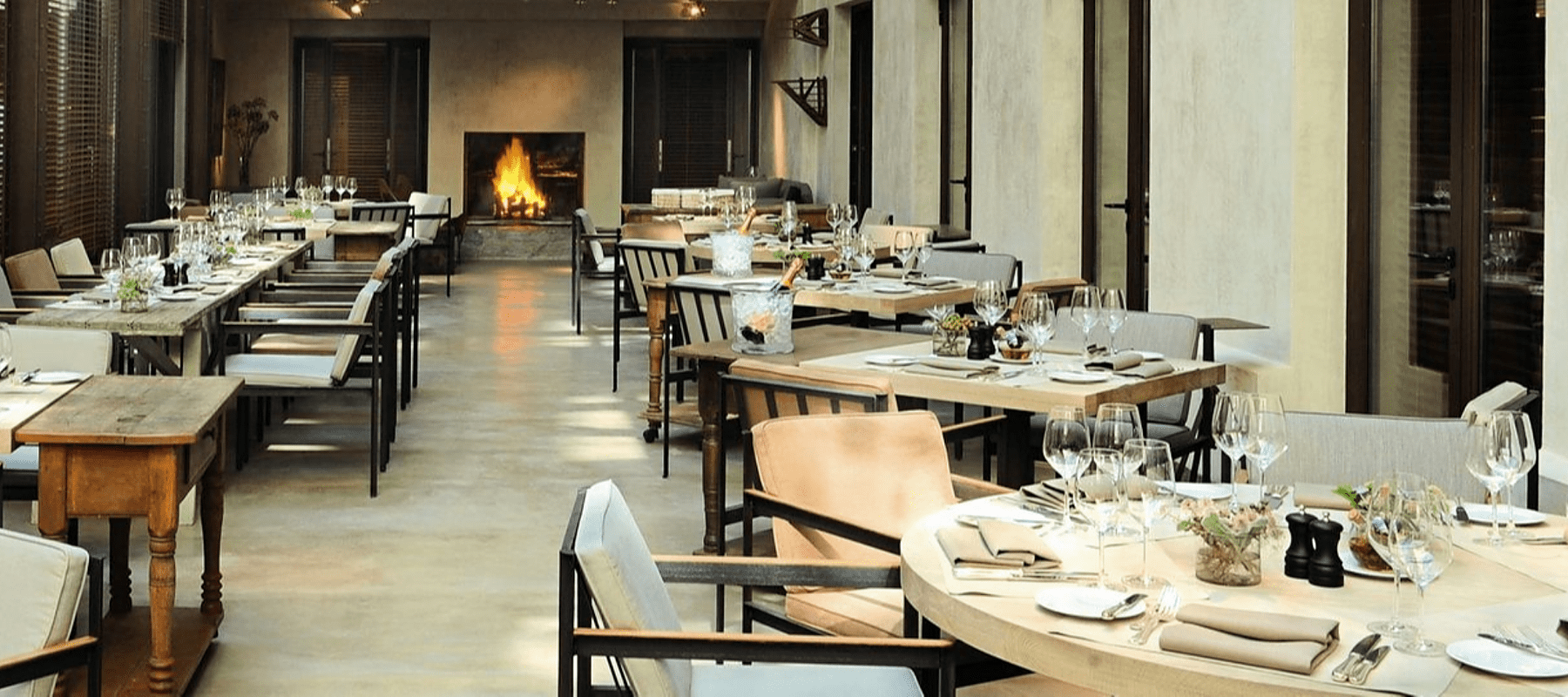 Интерьер заведения разработан известным бельгийским декоратором, антикваром и меценатом Акселем Вервордтом. Штрихи в индустриальном стиле создают здесь атмосферу художественной мастерской, а большой камин придает ей теплоты и домашнего уюта. Помимо основного зала, гостям доступна живописная терраса, украшенная живыми зелеными растениями.