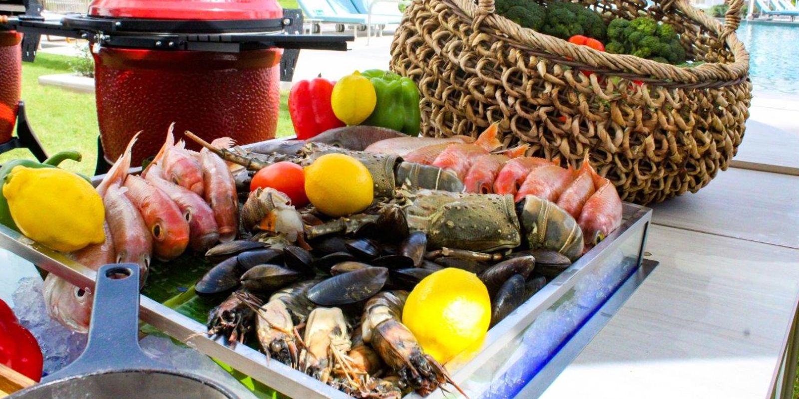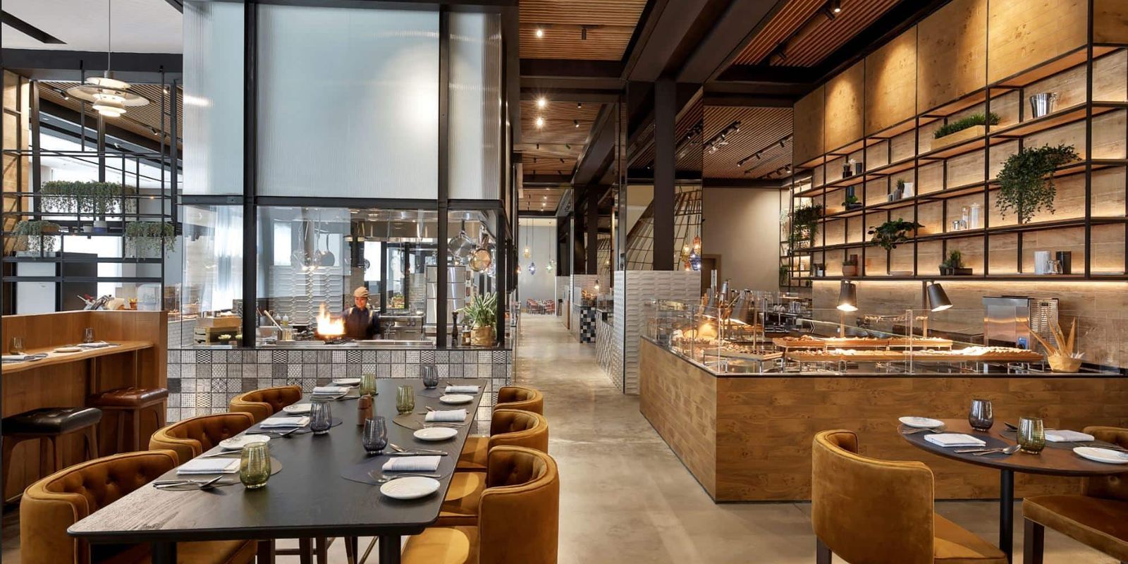 Гости могут отведать блюда из Graphos Social Kitchen, сидя рядом с одной из многочисленных открытых кухонь с видом на сверкающий бассейн.