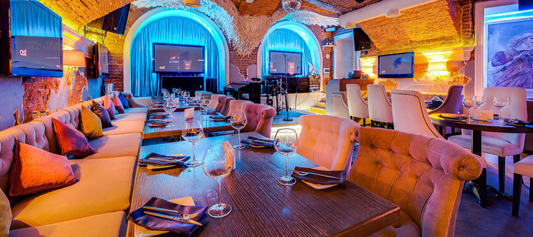 Интерьер заведения выполнен в стиле лофт, а его пространство удачно поделено на три зоны: бар, основной зал со сценой и отдельный VIP-зал на 30 человек.