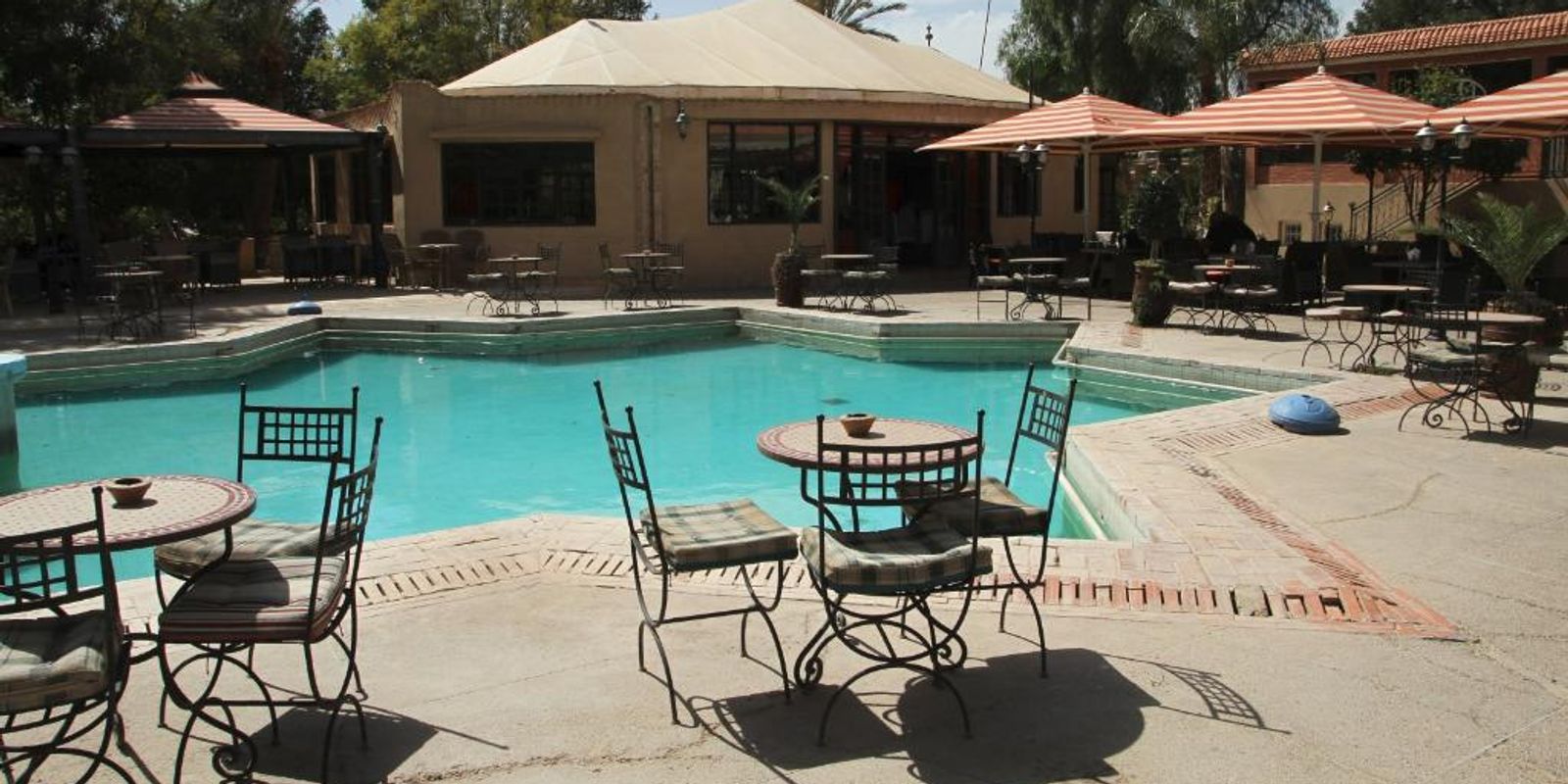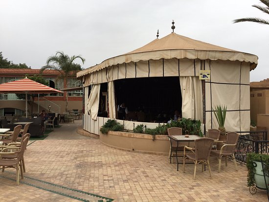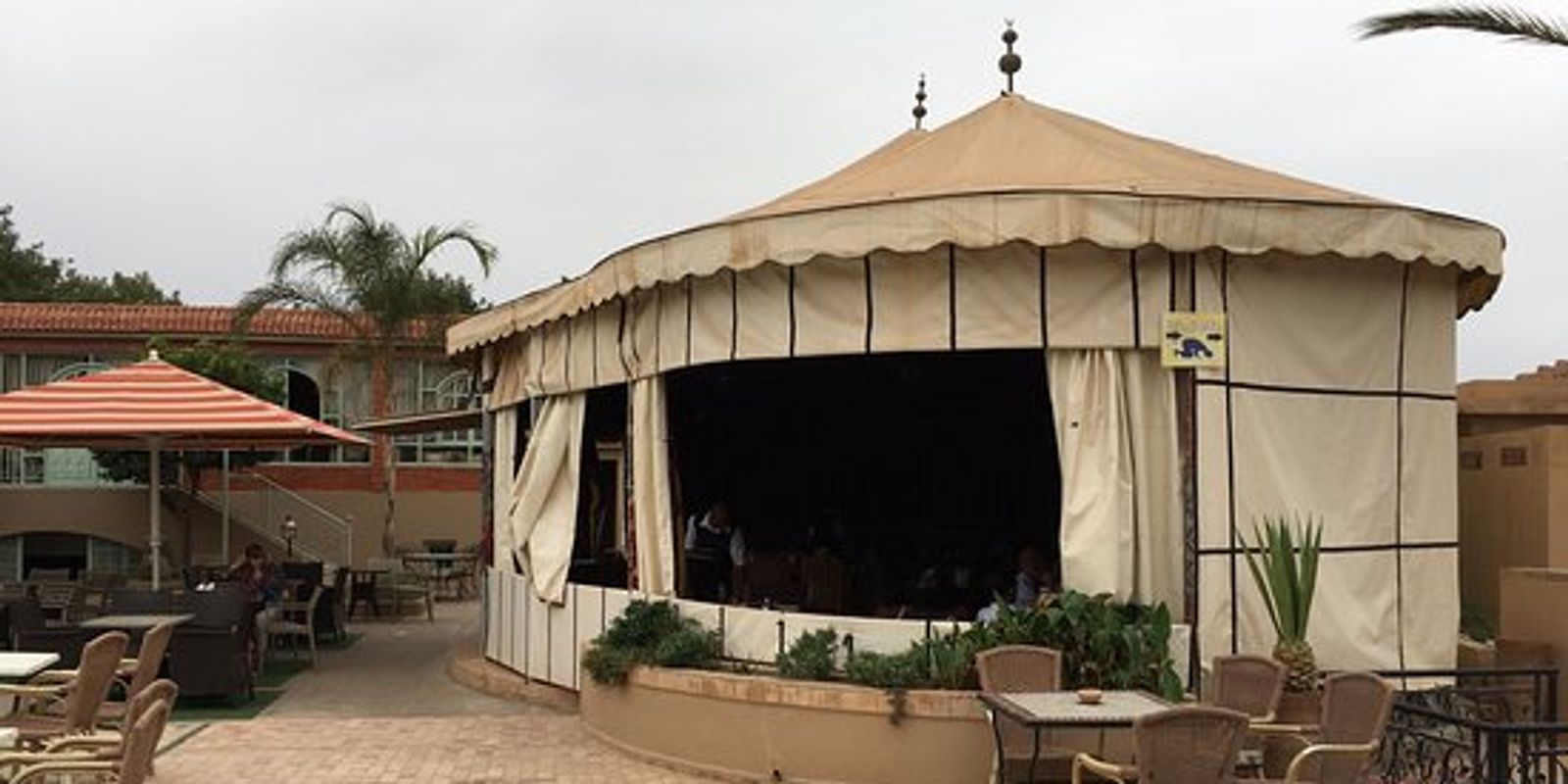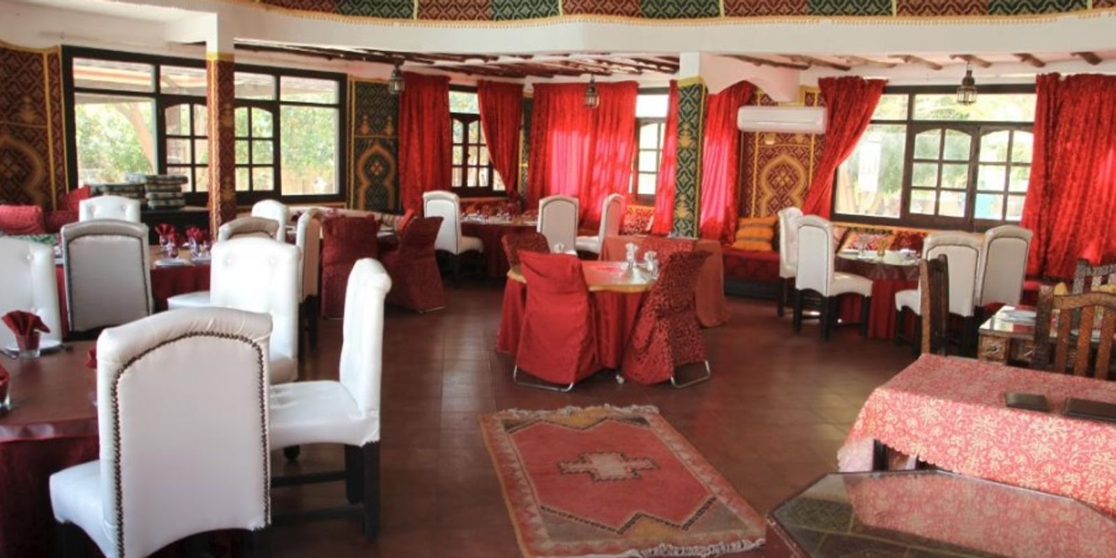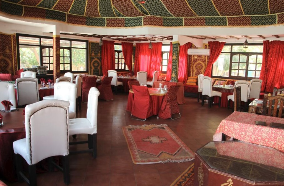 Прелестный сад из апельсиновых деревьев, бассейн в форме морской звезды, дарующий приятную свежесть, а также близость высоких крепостных стен Таруданта делают трапезу здесь особенной. Вид на горы Высокого Атласа буквально завораживает.